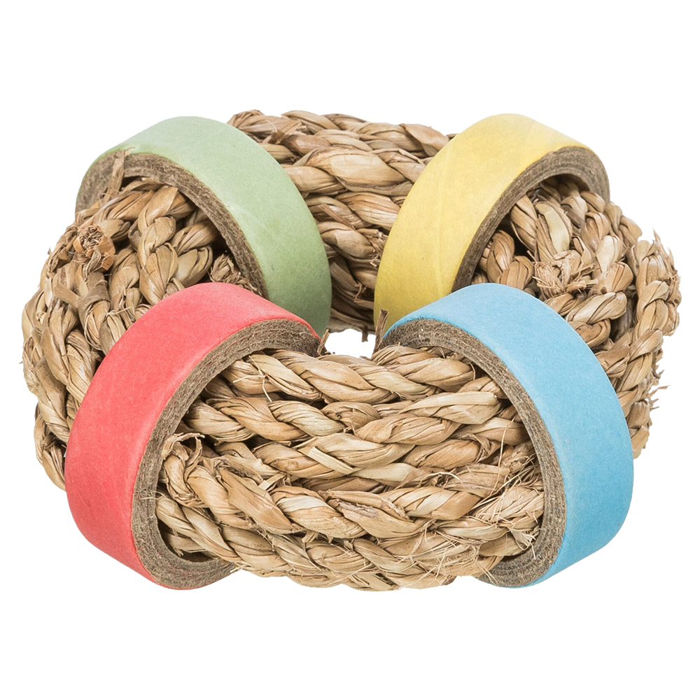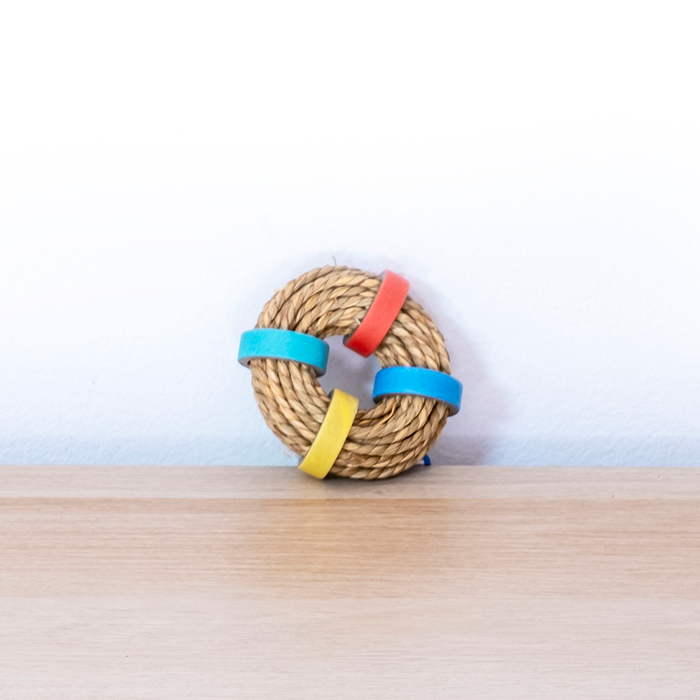 • Brinquedo circular de corda com argolas coloridas sobre mesa de madeira