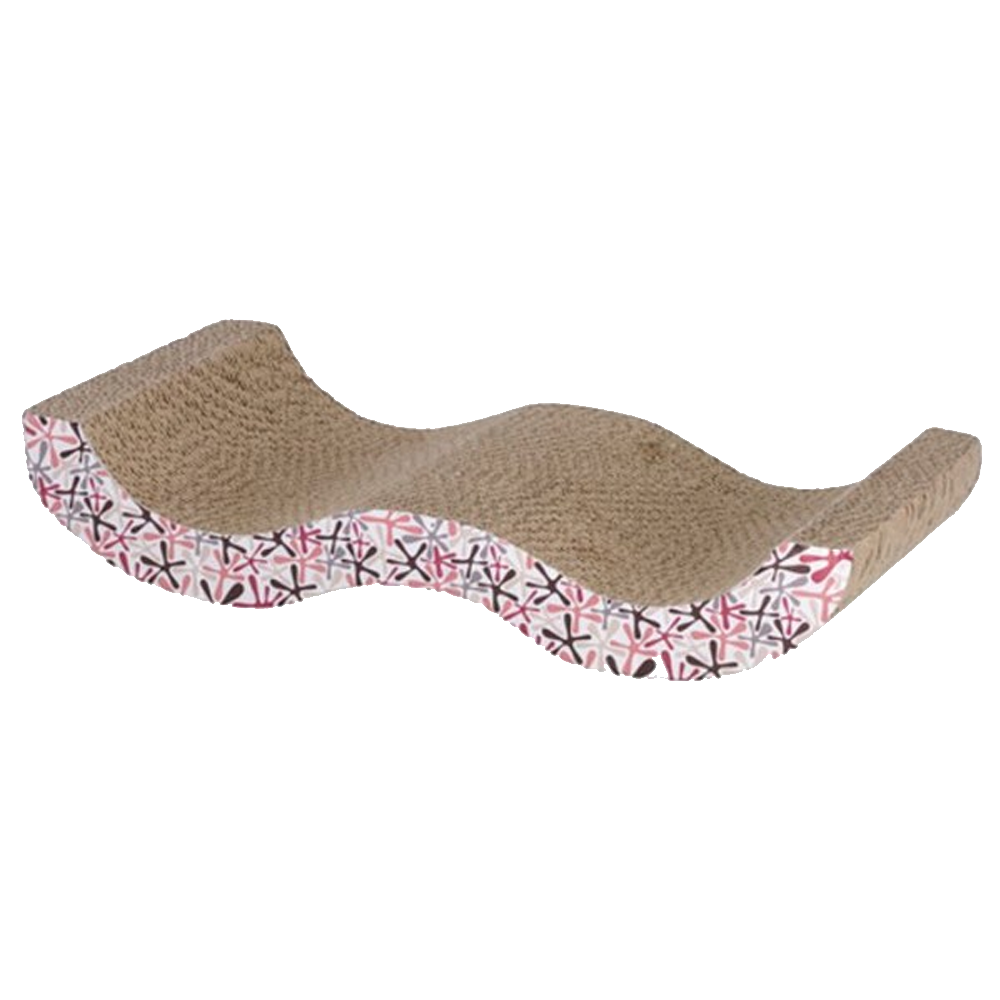 Arranhador ondulado para gatos em cartão reciclado com decoração geométrica rosa e preta