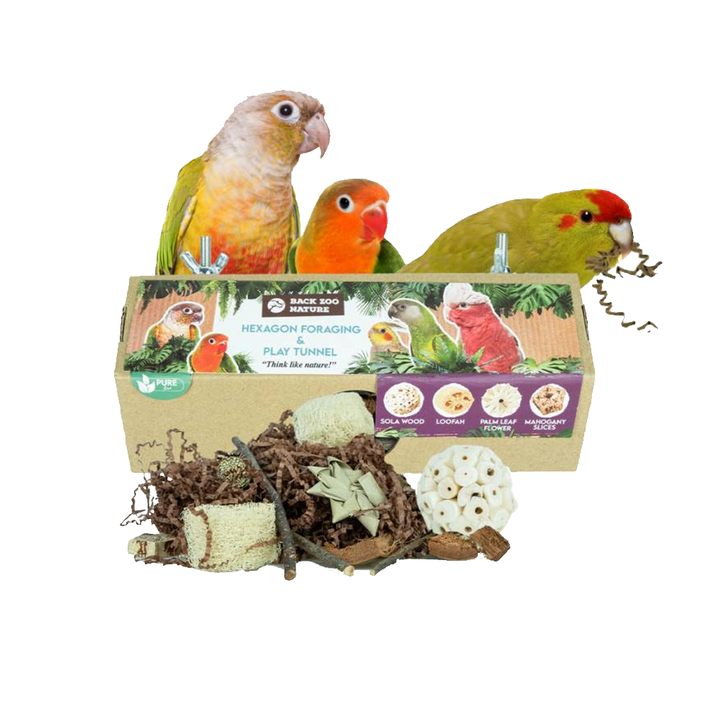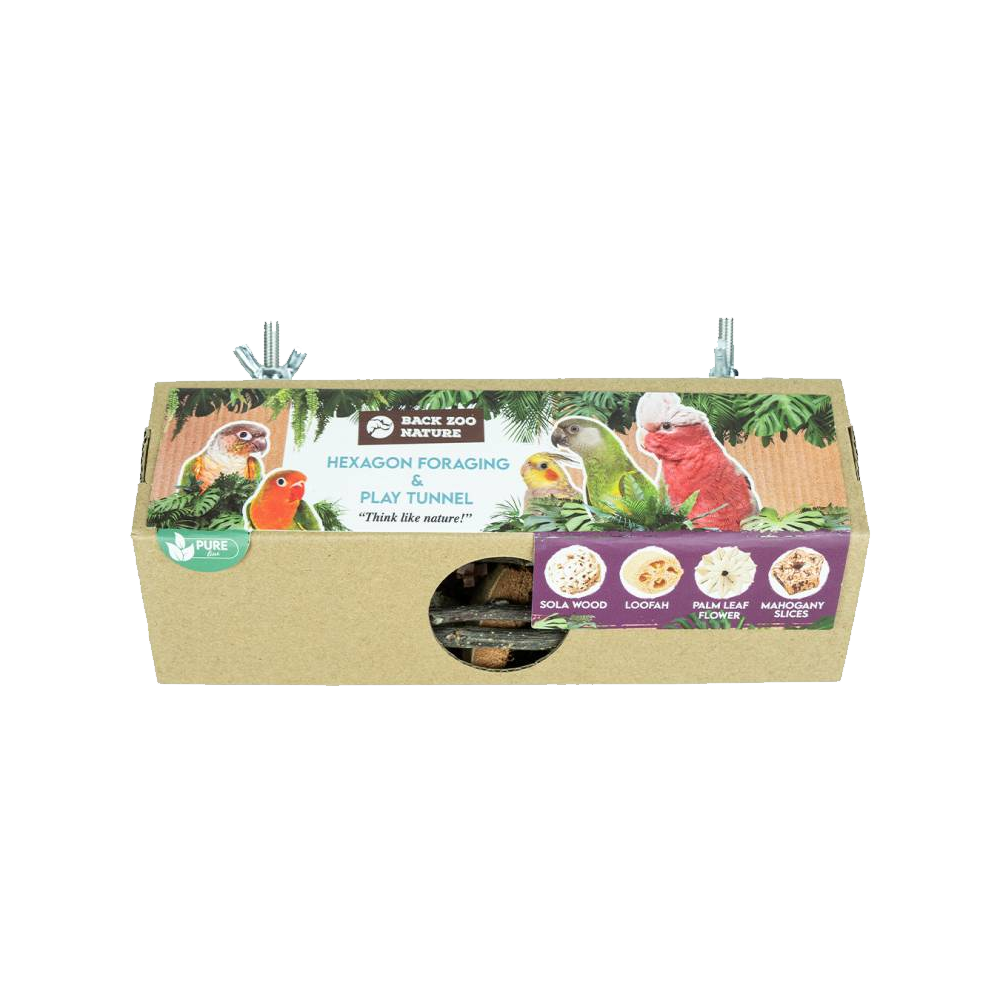 Dê ao seu pássaro uma diversão desafiadora e natural com o túnel de forrageamento e brincadeiras Hexagon da Back Zoo Nature.