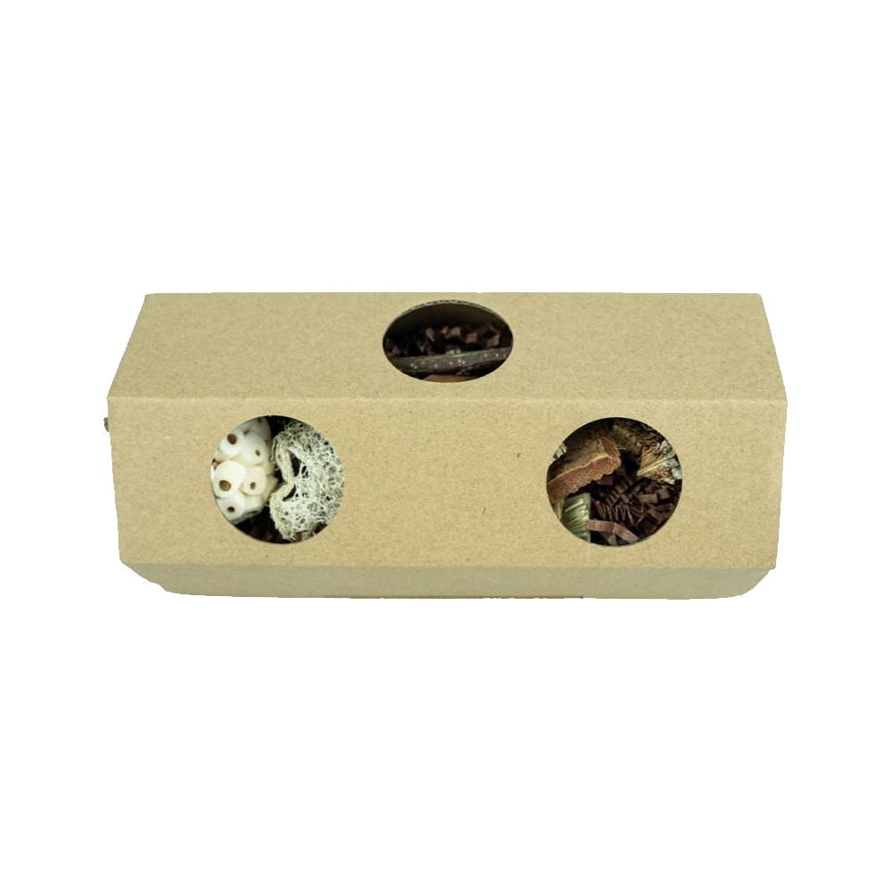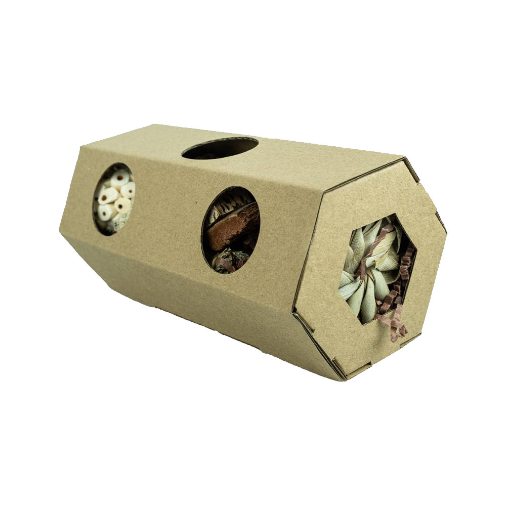 Este túnel exclusivo foi projetado para pássaros que amam variedade e novos estímulos. Preenchido com uma mistura de materiais naturais, como papel amassado, madeira de sola, bucha vegetal, folhas de palmeira e fatias de mogno, este túnel oferece a combinação perfeita de busca por comida, demolição e descoberta.