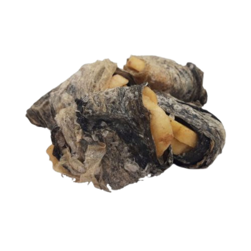 Os nossos Wraps de Banana, feitos com banana saborosa envolta em pele de peixe, são o petisco perfeito e sem culpa. Satisfaça o paladar do seu cão sem ingredientes nocivos.