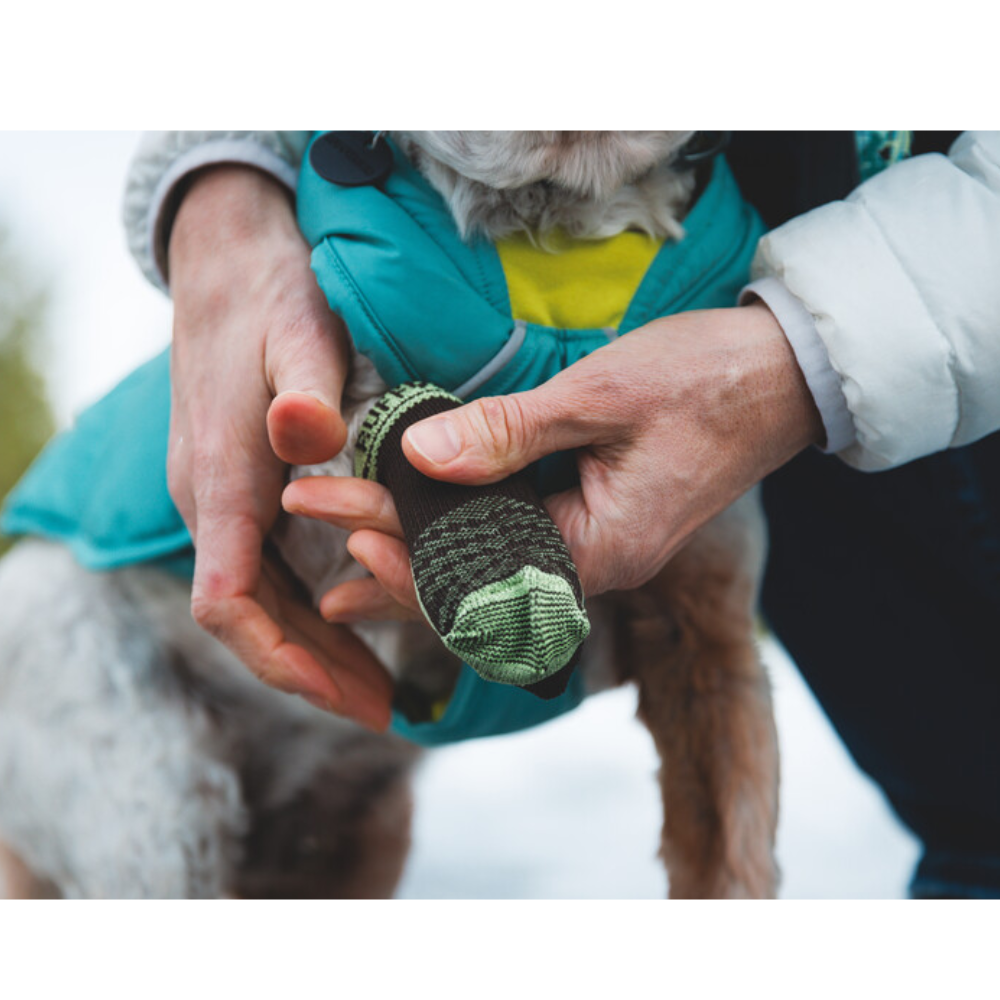 As meias Ruffwear Bark'n Boot™ são meias para cães que melhoram o ajuste, o desempenho e o conforto das botas. O tecido de malha especial e o formato anatómico adaptam-se à anatomia da pata do seu cão e minimizam o volume, facilitando a colocação das botas. Com material que absorve a humidade e cano afunilado, as meias Bark'n Boot™ secam rapidamente, proporcionam conforto e mantêm-se no lugar, mesmo que o seu cão tenha esporão.