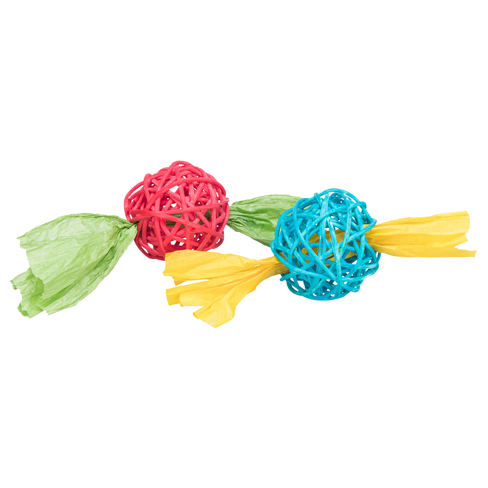 • Dois brinquedos coloridos para animais, vermelho com verde e azul com amarelo.