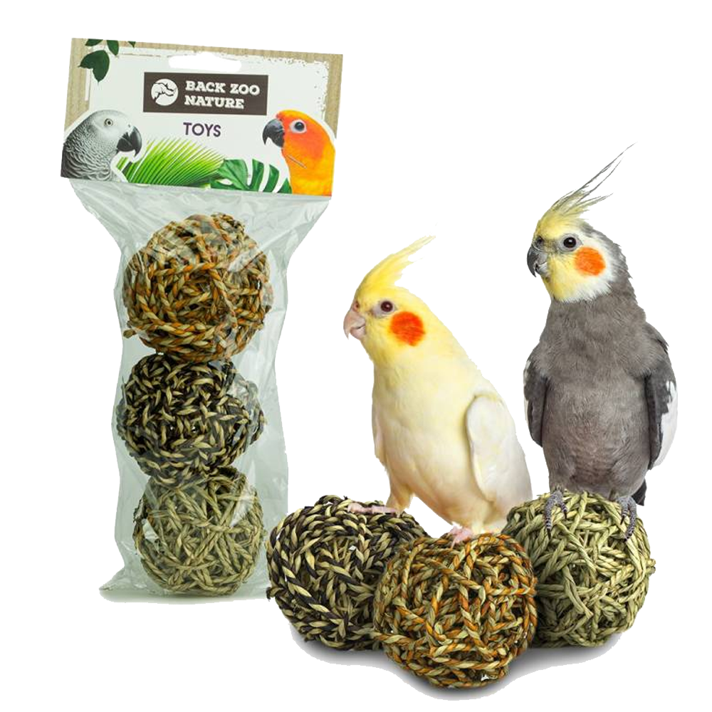 • Três bolas de brinquedo naturais para pássaros em embalagem com selo BACK ZOO NATURE TOYS