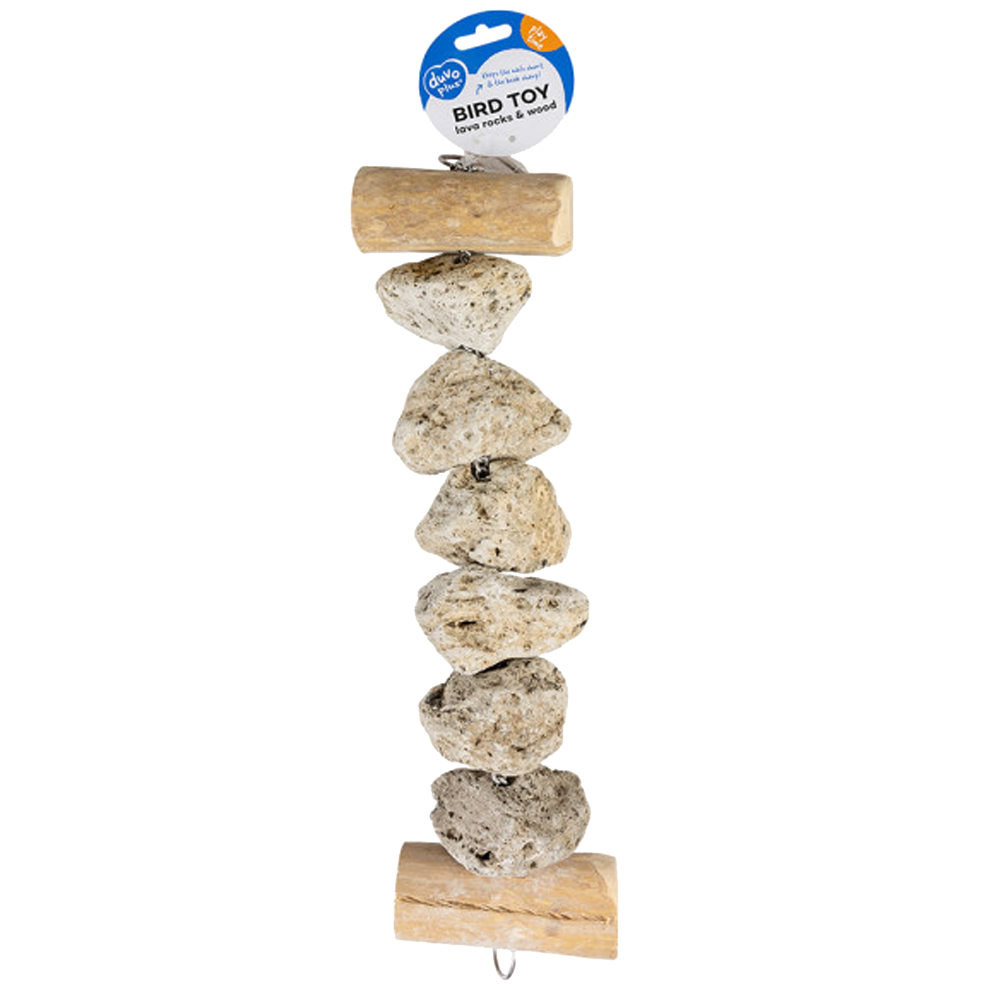 Feito de pedras vulcânicas e madeira java, este brinquedo para pendurar ajuda a manter as unhas curtas e o bico afiado. É um brinquedo natural adequado para todos os tipos de pássaros.