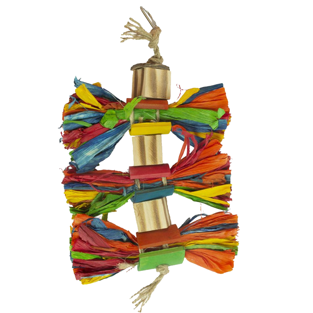 Os pássaros adoram brinquedos coloridos. Este brinquedo é feito de folhas de milho, bambu e coco e é um ótimo brinquedo para que eles possam brincar e mordiscar.