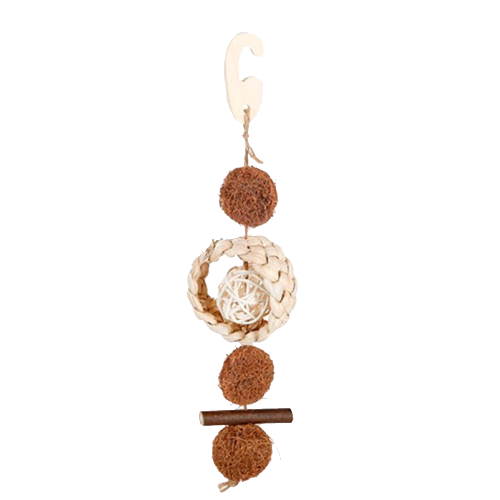 Brinquedo pendurado para animais com bolas de fibra natural, aro trançado e bastão de madeira