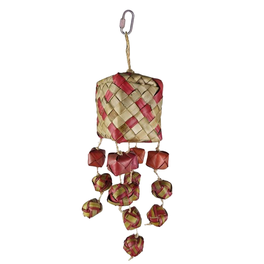 Material: Fabricado com materiais naturais, incluindo fibra de folhas de bananeira (Abaca), Palmeira, Buri e Milho. Esses materiais são biodegradáveis e ecologicamente corretos, tornando o brinquedo uma escolha sustentável tanto para as aves quanto para o meio ambiente.