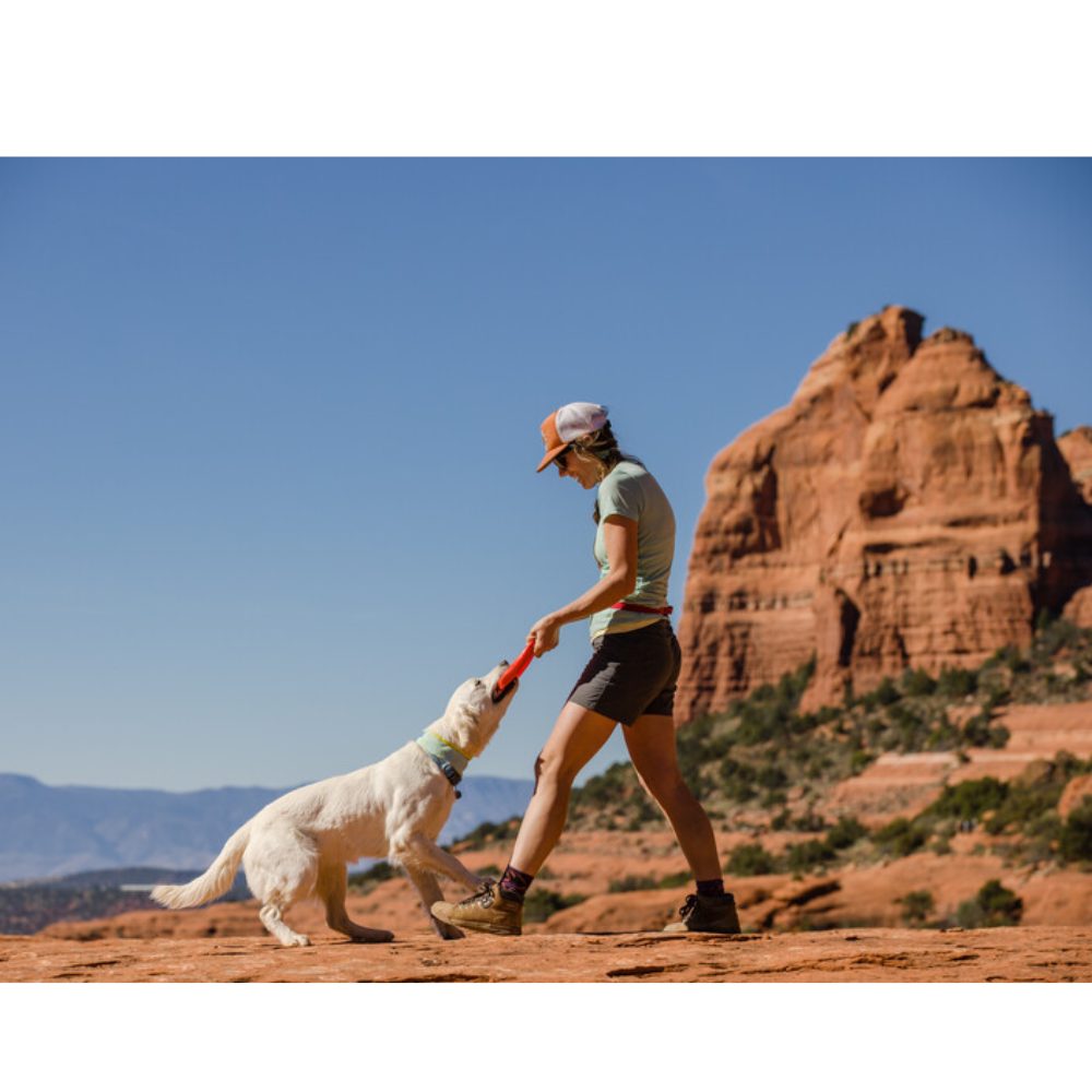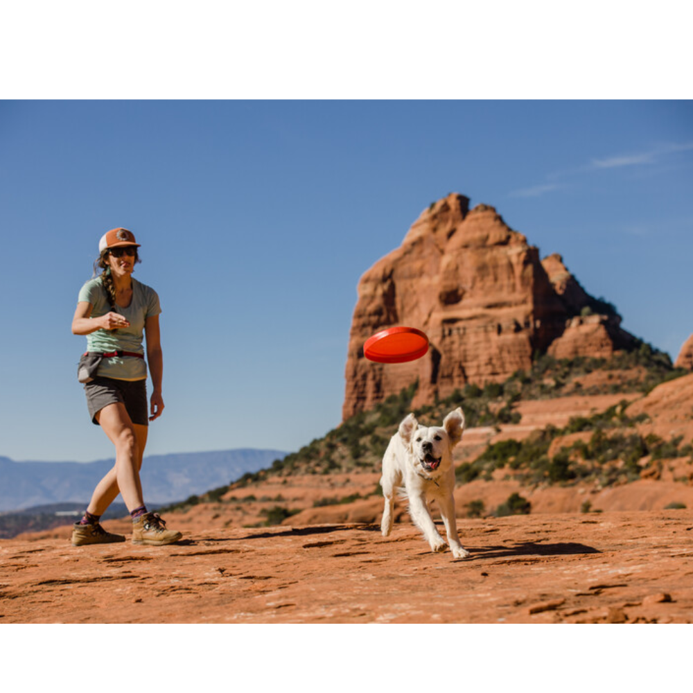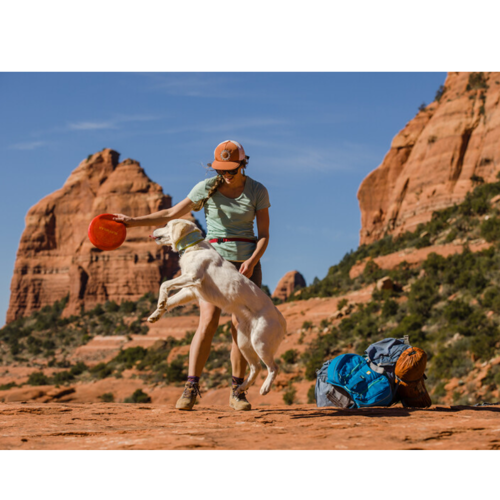 Quando o peso e a versatilidade são essenciais no meio da natureza, o Disco Camp Flyer destaca-se como um disco leve que serve também de comedouro entre as brincadeiras de busca no acampamento. A sua construção solida, flexível e resistente a perfurações, é suave para os dentes e gengivas do seu cão, mas estruturada o suficiente para voar e manter a sua forma, mesmo depois de ser guardado na mochila. As cores vibrantes facilitam o rastreio no ar e a localização na vegetação, garantindo ao Camp Flyer um lugar merecido no topo da lista de artigos essenciais para qualquer cão.