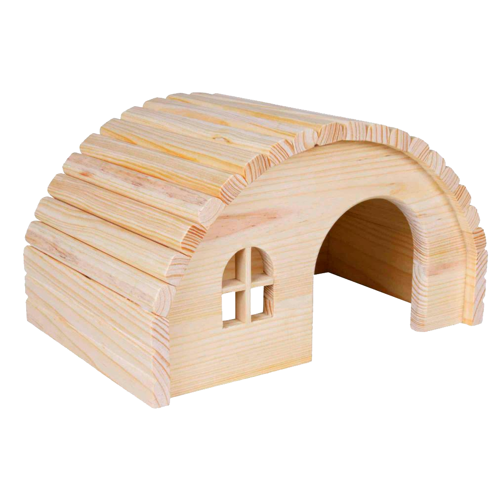 • Casa de madeira clara para pequenos animais com design em tábuas redondas e pequena janela