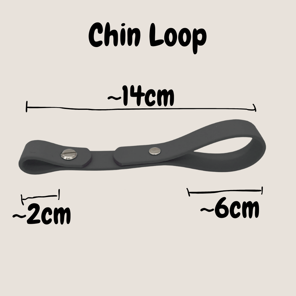 • Chin Loop preto com botões metálicos e texto explicativo em português