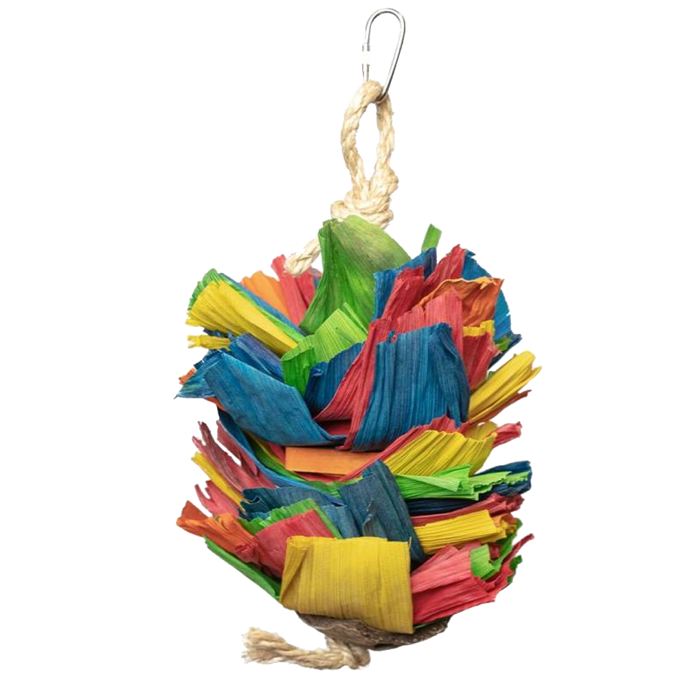 Com a Corn Leaf Cascade você traz um verdadeiro festival de cores para sua casa! Este brinquedo animado da Back Zoo Nature é feito de materiais naturais e convida o seu pássaro a uma viagem natural de descoberta! Os inúmeros pedaços de folhas de milho formam um verdadeiro paraíso de demolição que seu pássaro pode mordiscar, roer e puxar. O design lúdico desta Corn Leaf Cascade ainda oferece um esconderijo para lanches e guloseimas, então este brinquedo também pode ser usado como brinquedo de coleta de alimentos.