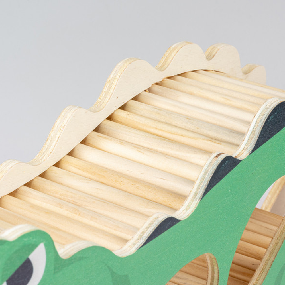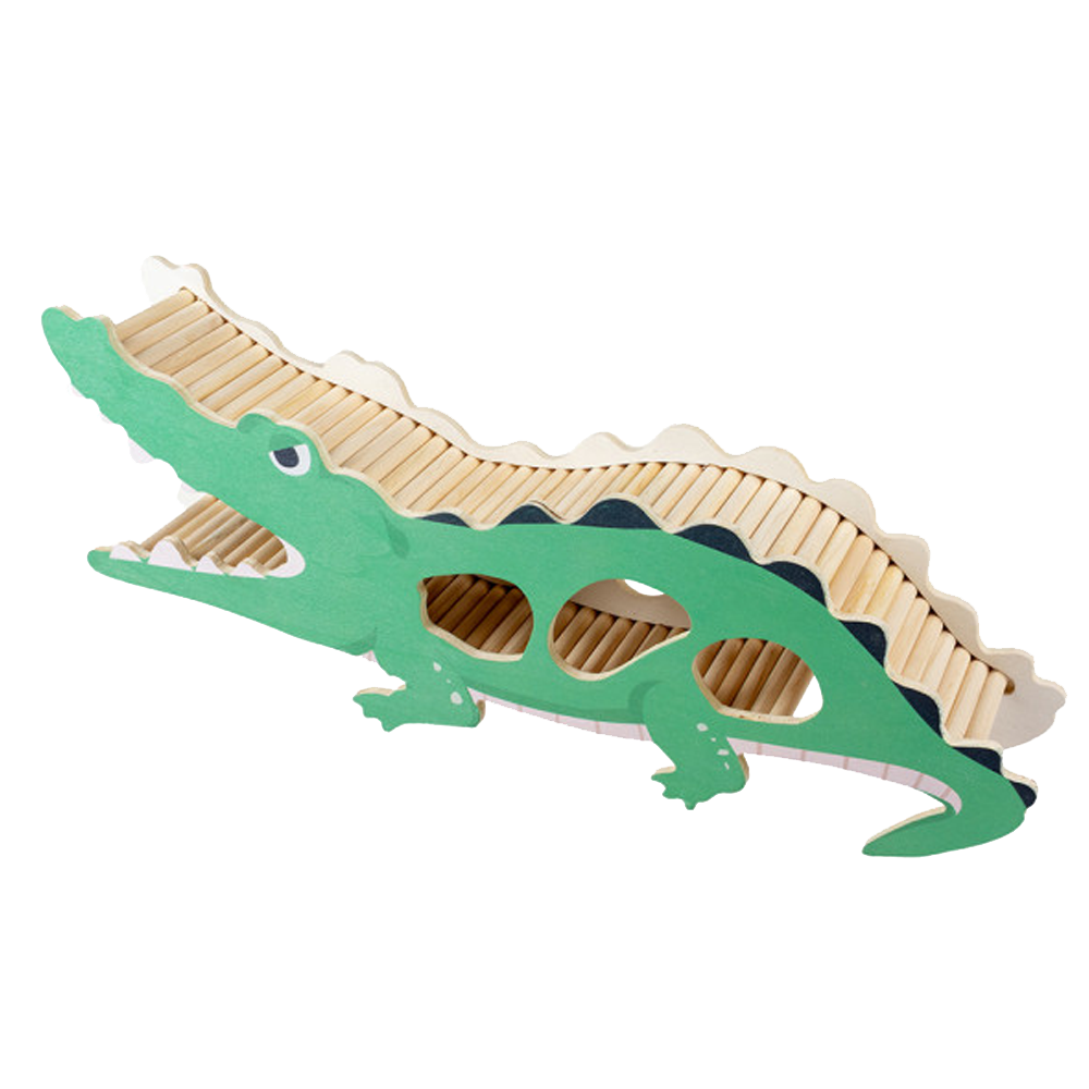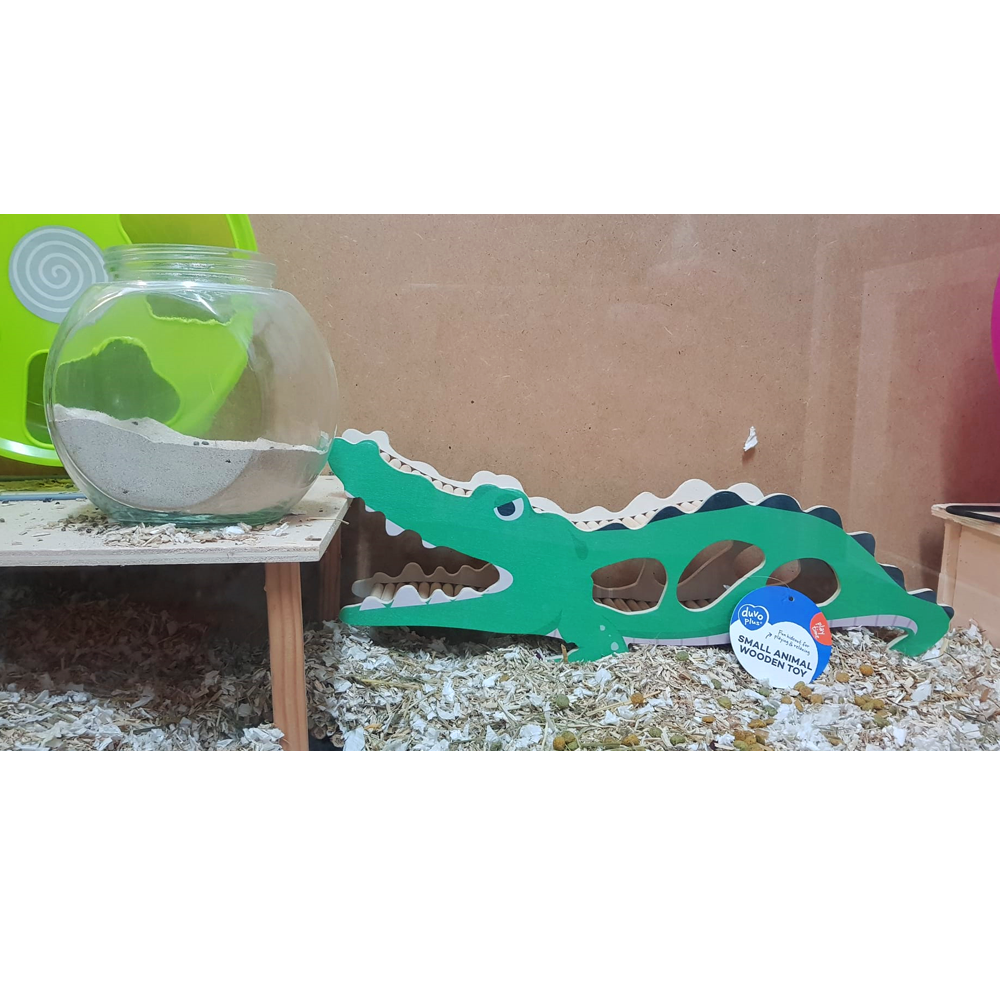 Feito em madeira, este abrigo em forma de crocodilo oferece um lugar seguro a pequenos roedores. A tinta utilizada é amiga dos animais, garantindo a sua segurança e diversão.