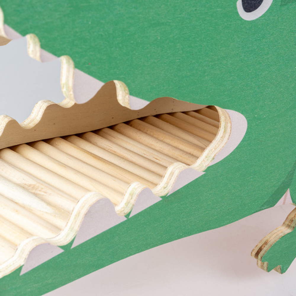 • Brinquedo de madeira em forma de crocodilo verde com dentes recortados