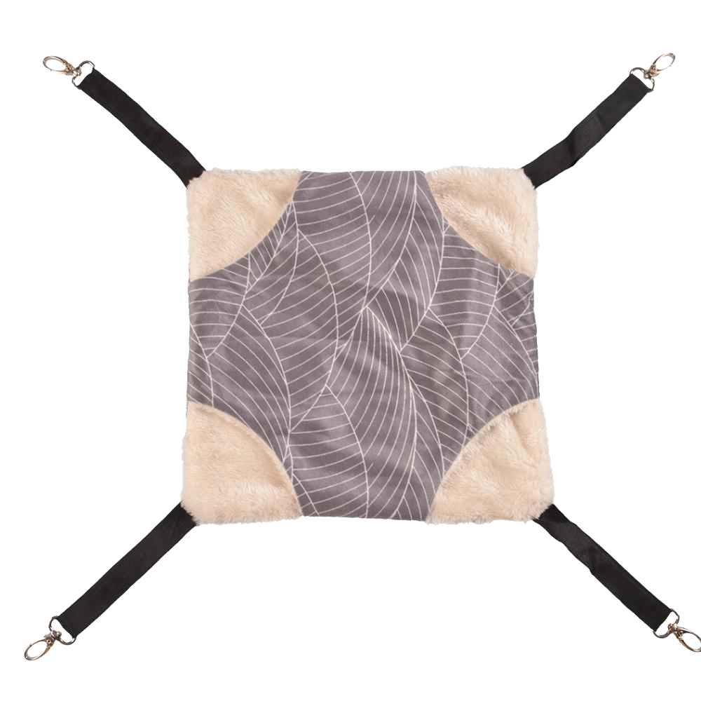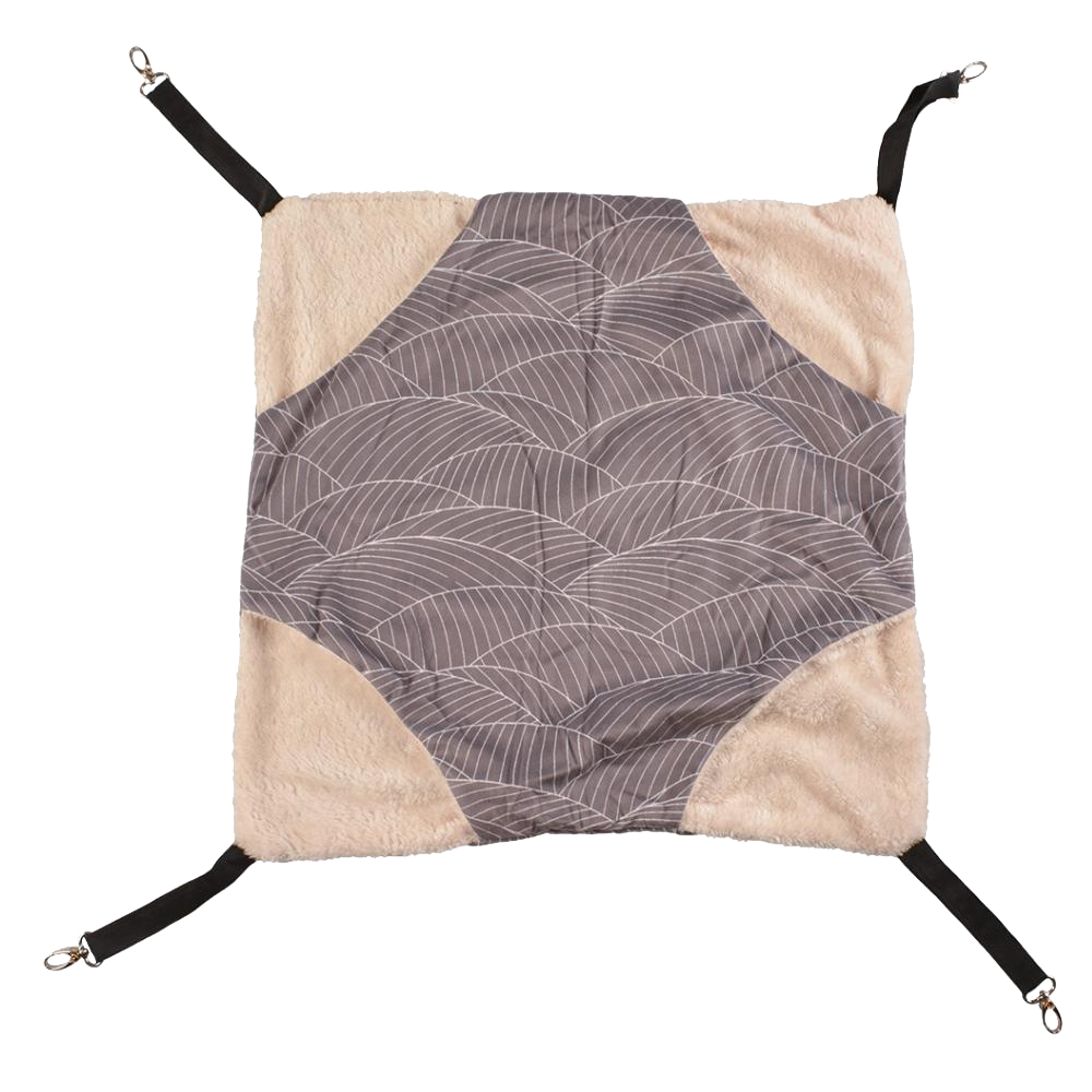 Rede para animais em tecido cinzento com padrão de folhas e pelúcia bege