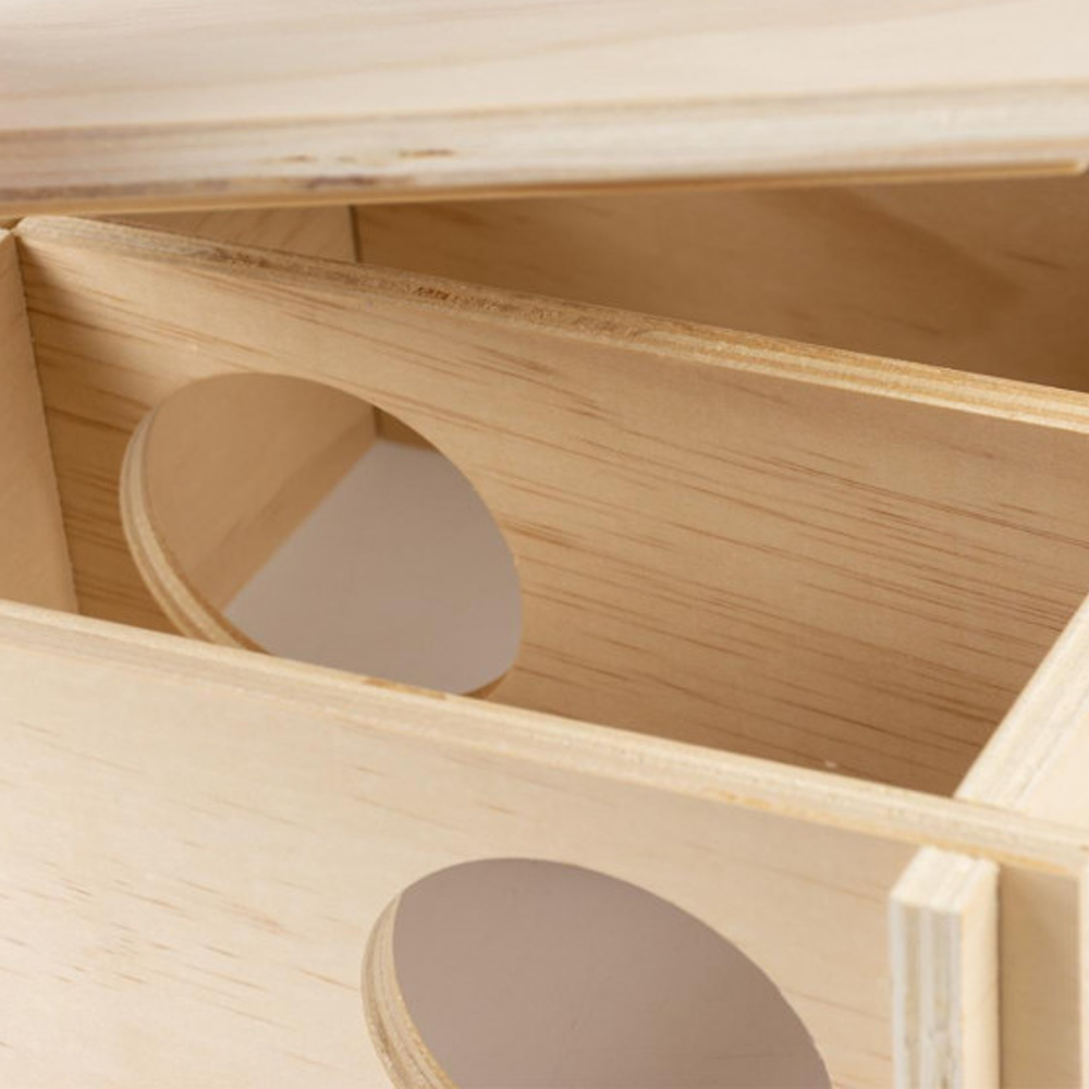 Esconderijo subterraneo para pequenos animais em madeira natural.