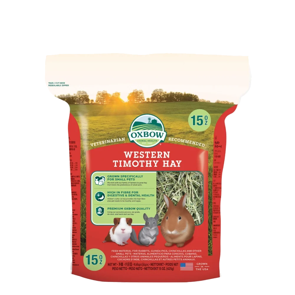 O Western Timothy Hay totalmente natural da Oxbow é um fenonutritiva e de cheiro doce que estimulará o apetite de seu coelho, porquinho-da-índia, chinchila ou outro pequeno animal de estimação. Western Timothy é o feno recomendado pelo veterinário nº 1 para pequenos herbívoros.