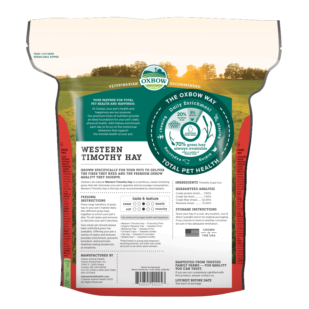 • Embalagem de feno para animais Oxbow Western Timothy Hay com informações detalhadas