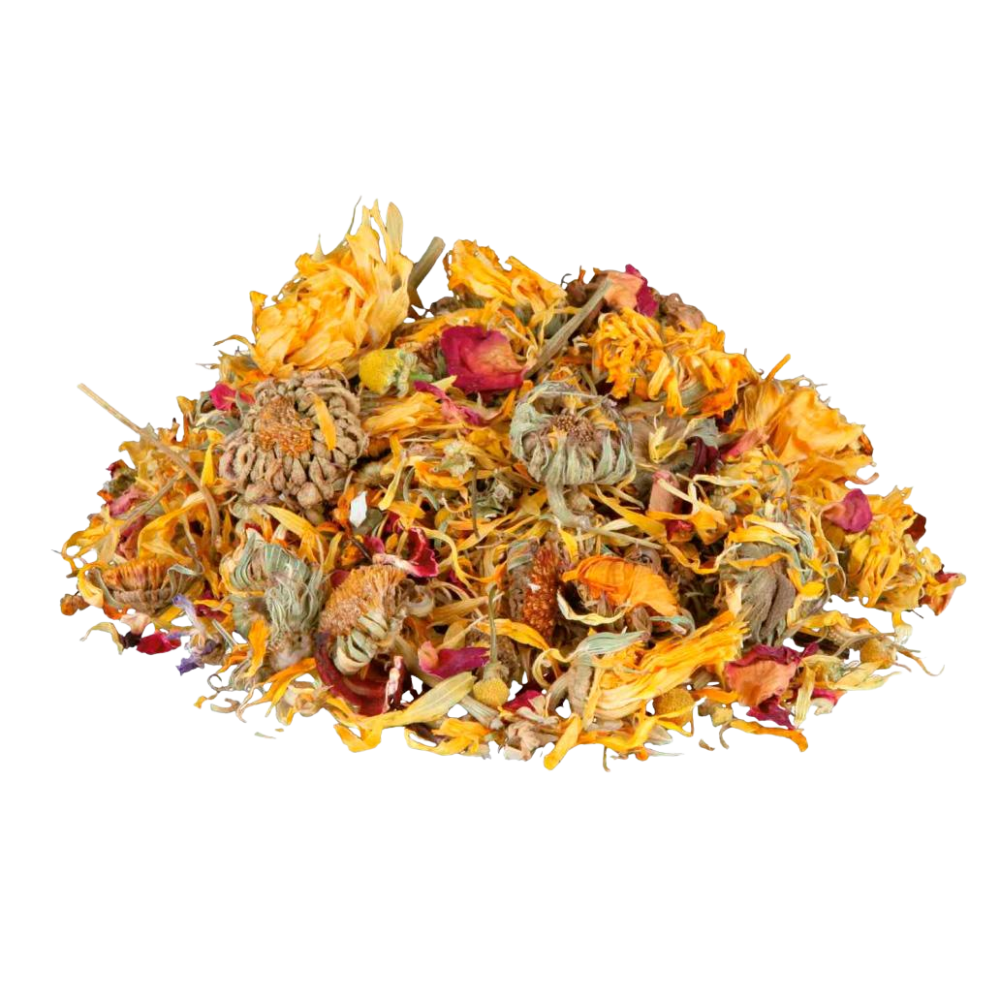 Clendula, flor de hibiscus, flor de camomila, petalas de rosa, roseira brava, folhas de menta, salva, hipericão, flor de malva (flores 94%)