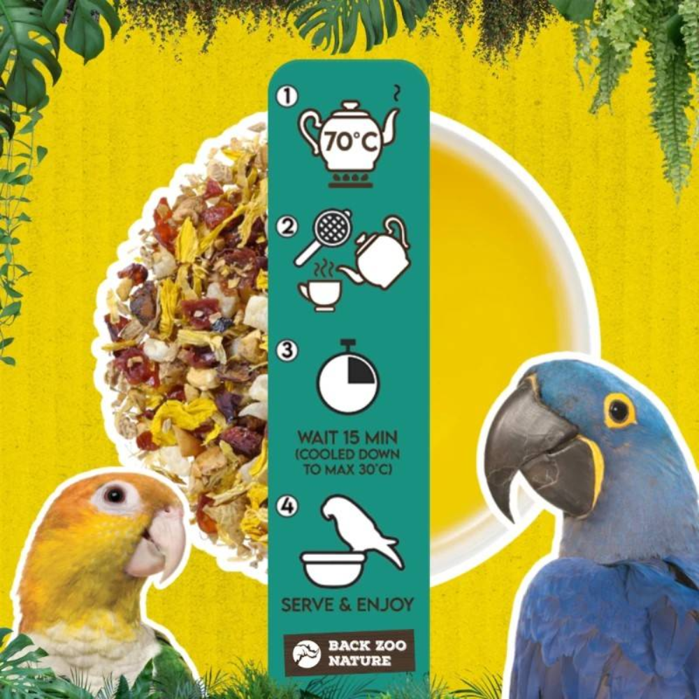 Mime o seu pássaro com o equilíbrio perfeito entre sabor e bem-estar! O Chá para Papagaios Back Zoo Nature é um delicioso chá de ervas que pode ser servido quente ou frio. Saúde e hidratação nunca foram tão deliciosas!