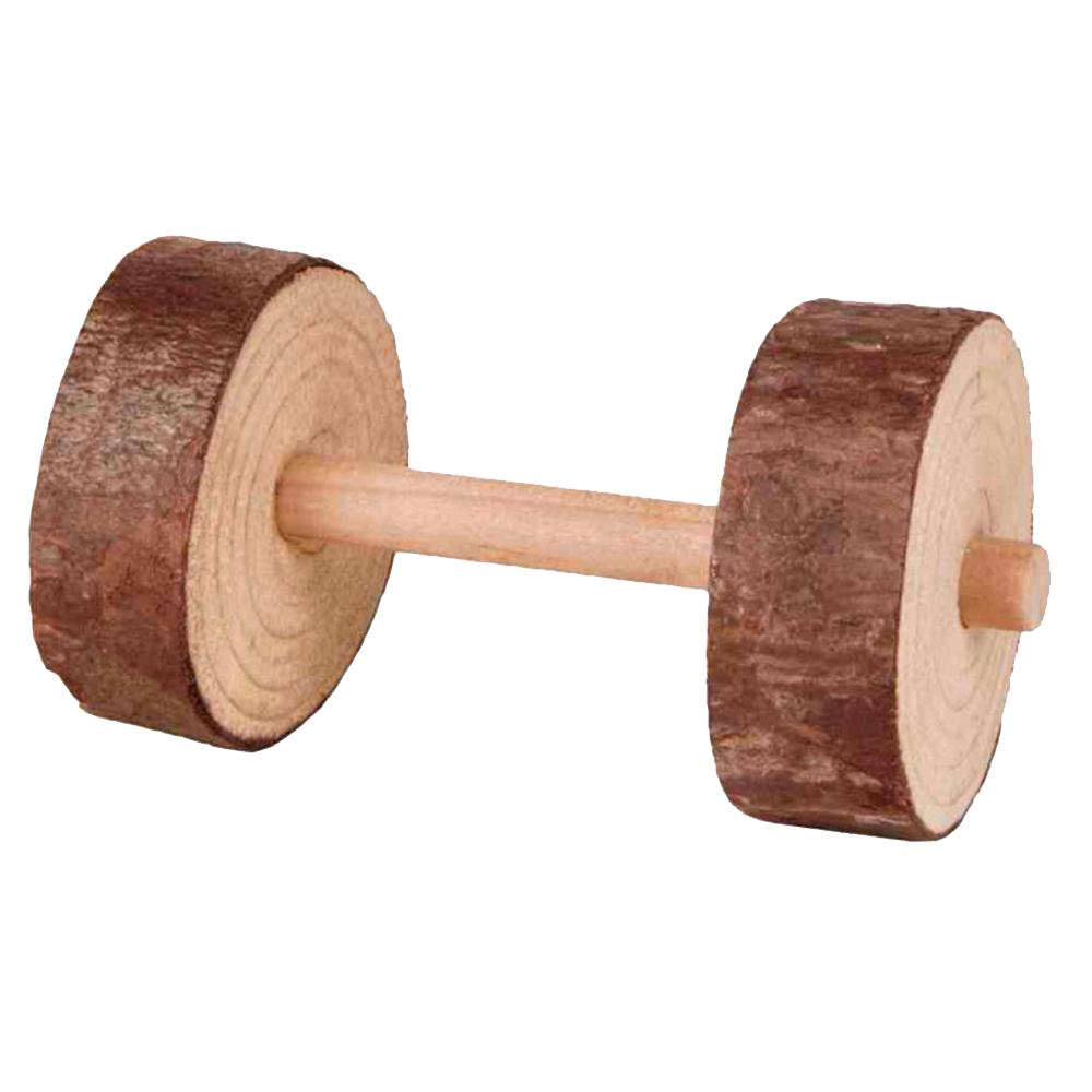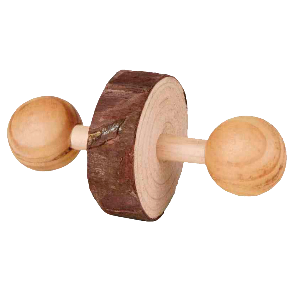 • Brinquedo de madeira com cilindro de tronco natural e bolas nas extremidades