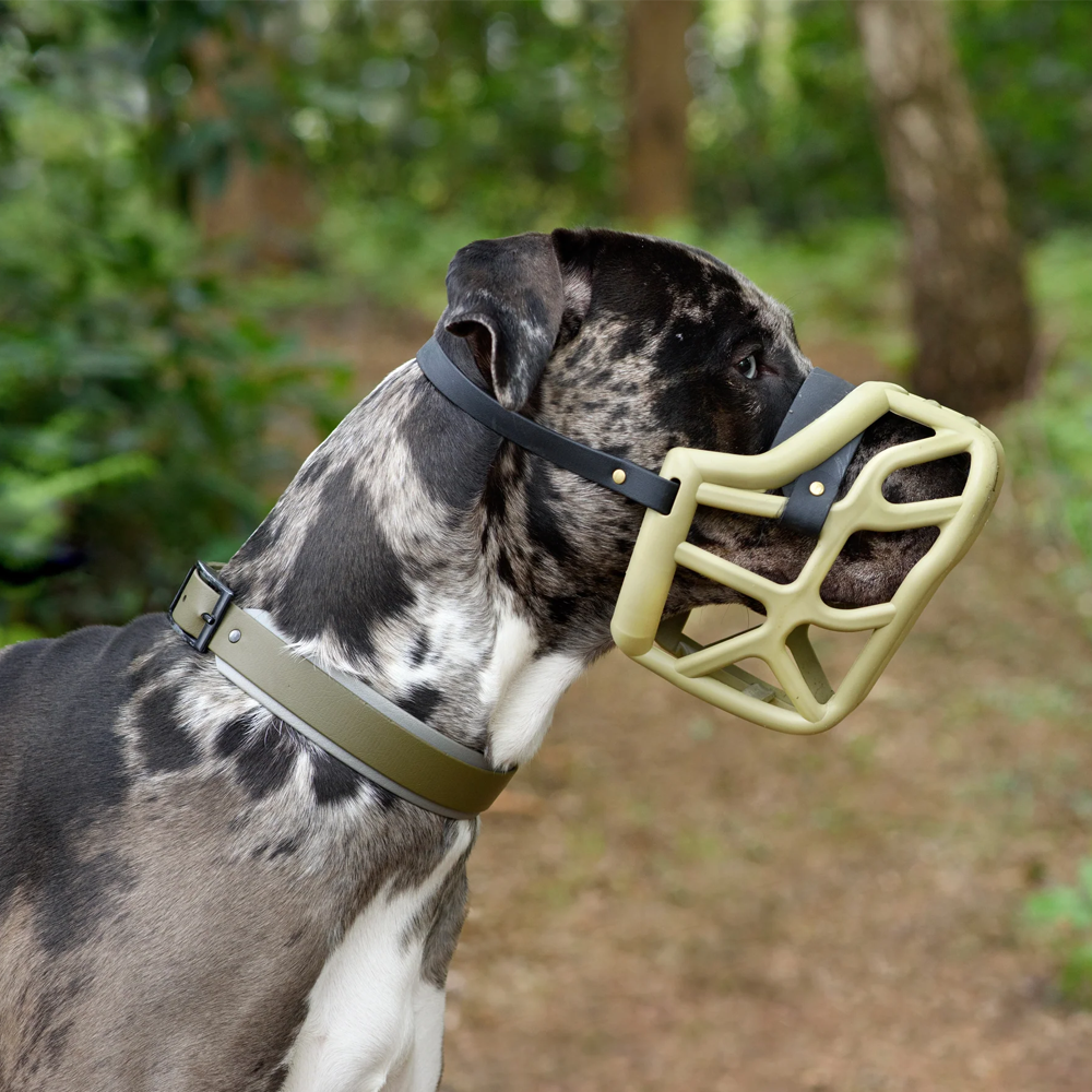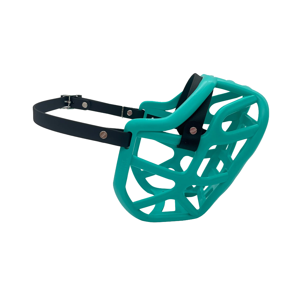 Esta é a açaime de tamanho médio da nossa coleção de Ajuste Curto e Largo – ideal para cães com cabeças largas e focinhos relativamente curtos.