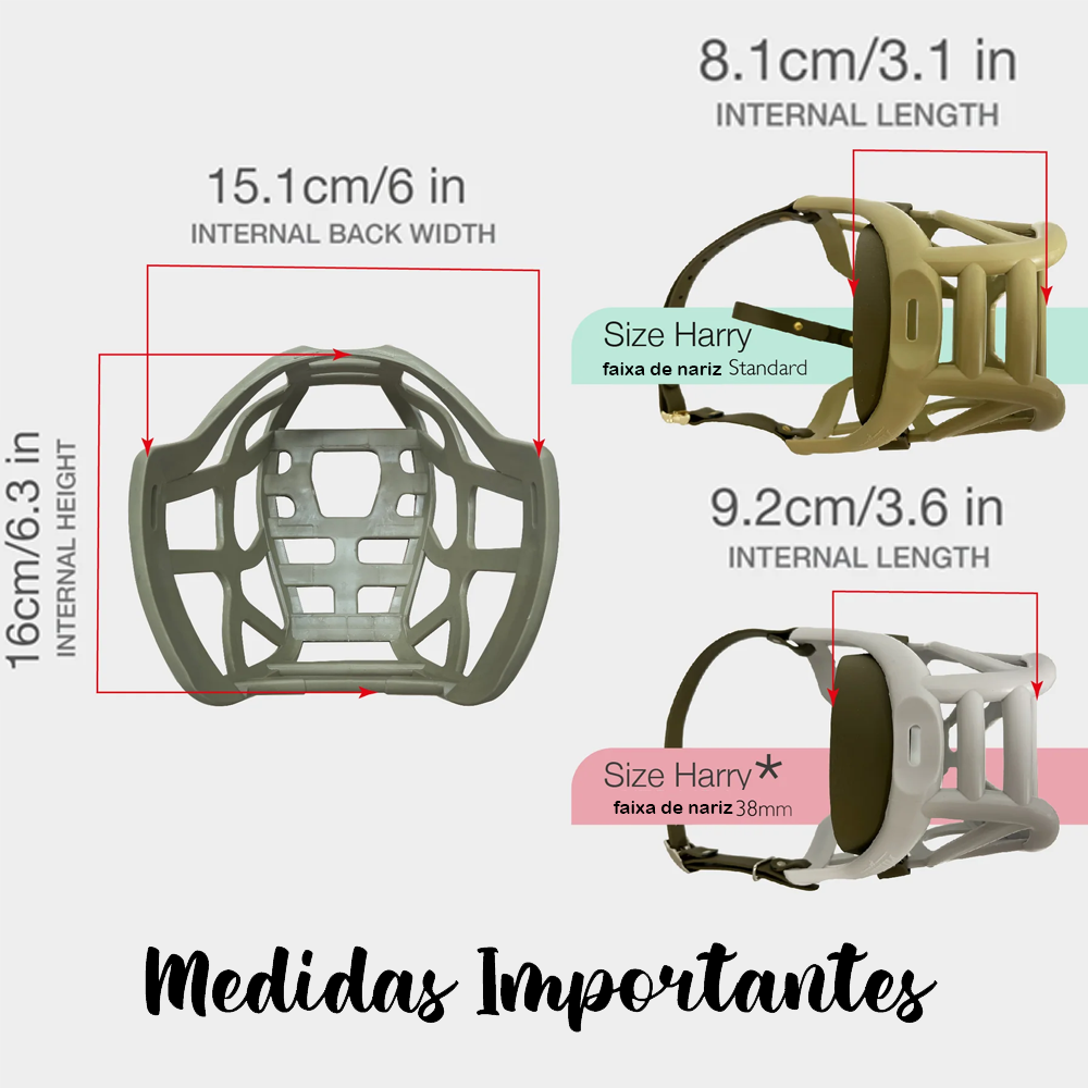 Se a largura e o comprimento estiverem no intervalo, mas a altura não, o cão não conseguirá abrir a boca na totalidade, e não recomendamos o uso do açaime durante longos periodos de tempo ou para realizar actividades físicas.