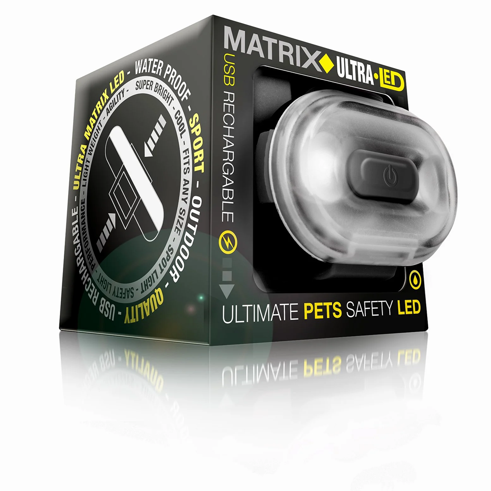 O nosso Matrix Ultra LED possui quatro modos de iluminação diferentes (brilhante, menos brilhante, económico e intermitente). Para máxima flexibilidade, os LED são totalmente à prova de água e submersíveis (IP6). Suportam a chuva ou até mesmo um banho de lago sem problemas. A tira dinâmica de silicone permite uma fixação segura à coleira, trela e peitoral, com uma largura até 2,5 cm. O Ultra Matrix LED é o pequeno holofote ideal para a sua caminhada no escuro e oferece mais visibilidade no trânsito.