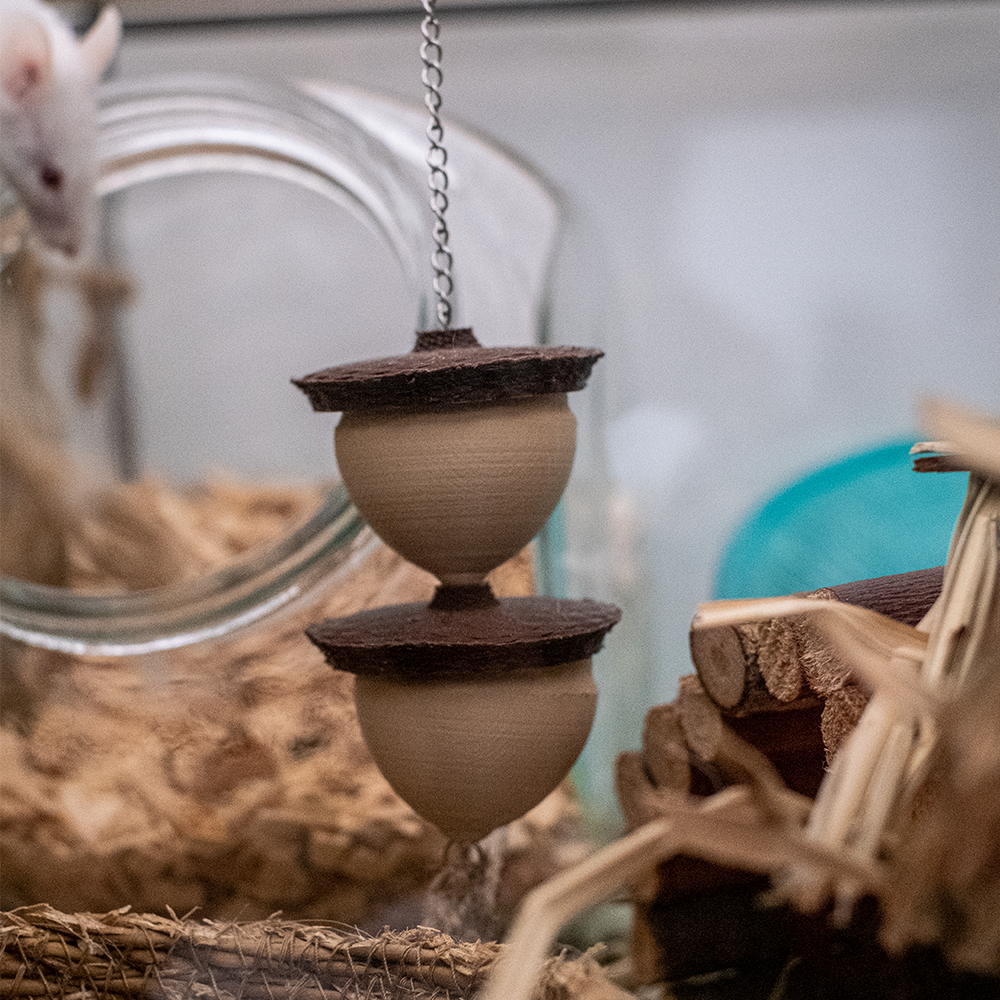 Este brinquedo é desenhado e produzido em Portugal, com recurso à tecnologia de impressão 3D. É feito em PLA, Ácido Poliláctico, que é um bioplástico feito através de recursos renováveis como o amido de milho e a cana de açúcar. O PLA usado na produção destes productos é também de produção nacional. O PLA é um material não tóxico e seguro para estar em contacto com os alimentos secos dos nossos animais.