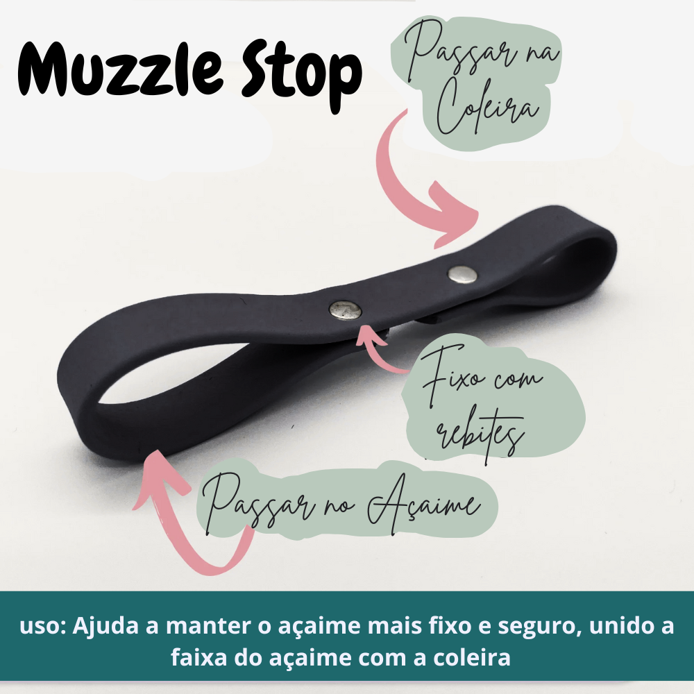 Muzzle Stop preto com rebites prateados e texto explicativo em português