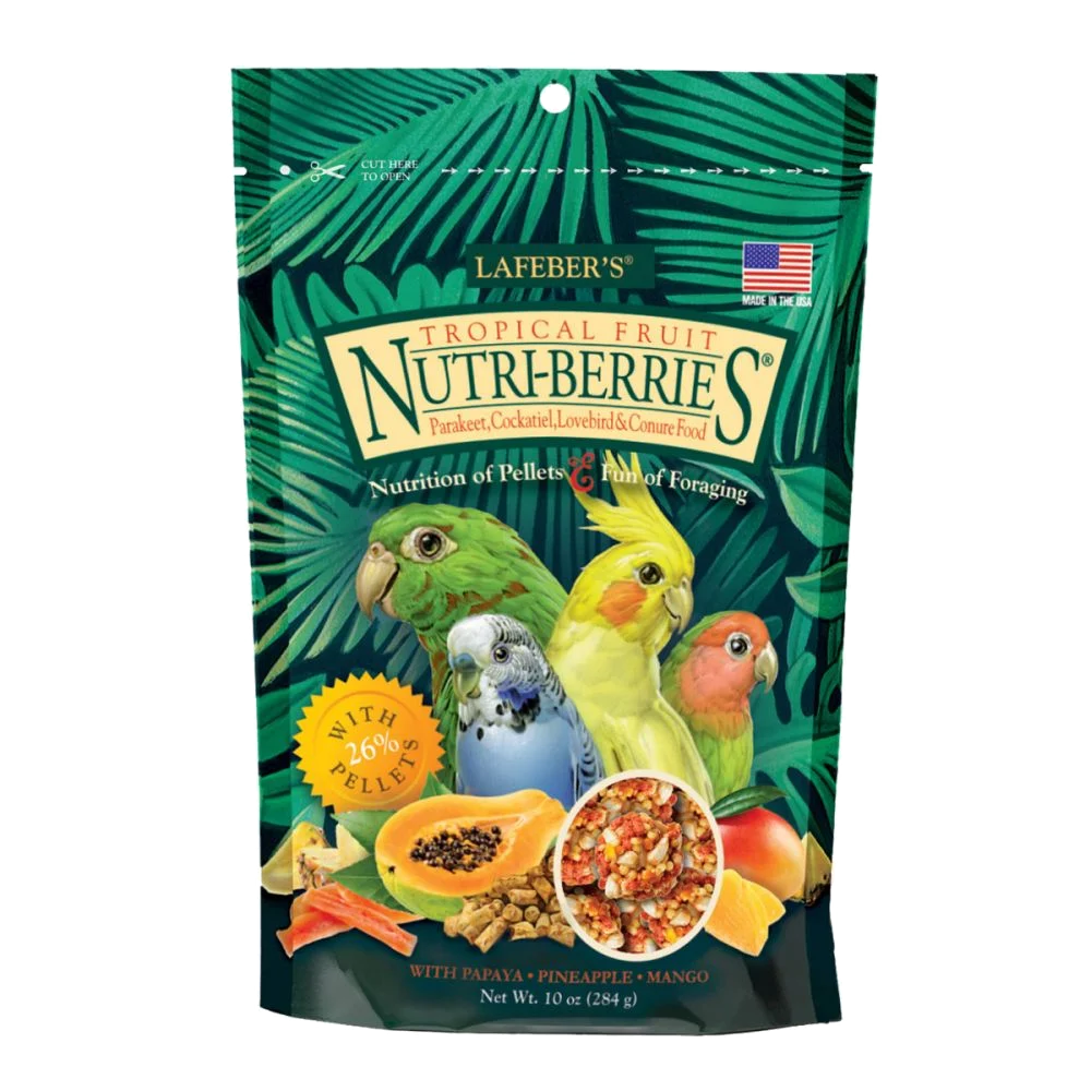 Nutri-Berrie é um alimento nutricionalmente completo para psitacídeos de pequeno e médio porte, com os sabores e texturas tão adorados pelos animais, e com o valor nutricional adequado. Tropical Fruit Nutri-Berries, combina sementes inteiras, grãos e pellets( 26%) com pedaços reais de abacaxi, mamão e manga, em porções dimensionadas para caturras, bem como periquito-monge, conures, agapornis, periquitos e outros psitacídeos do mesmo porte.