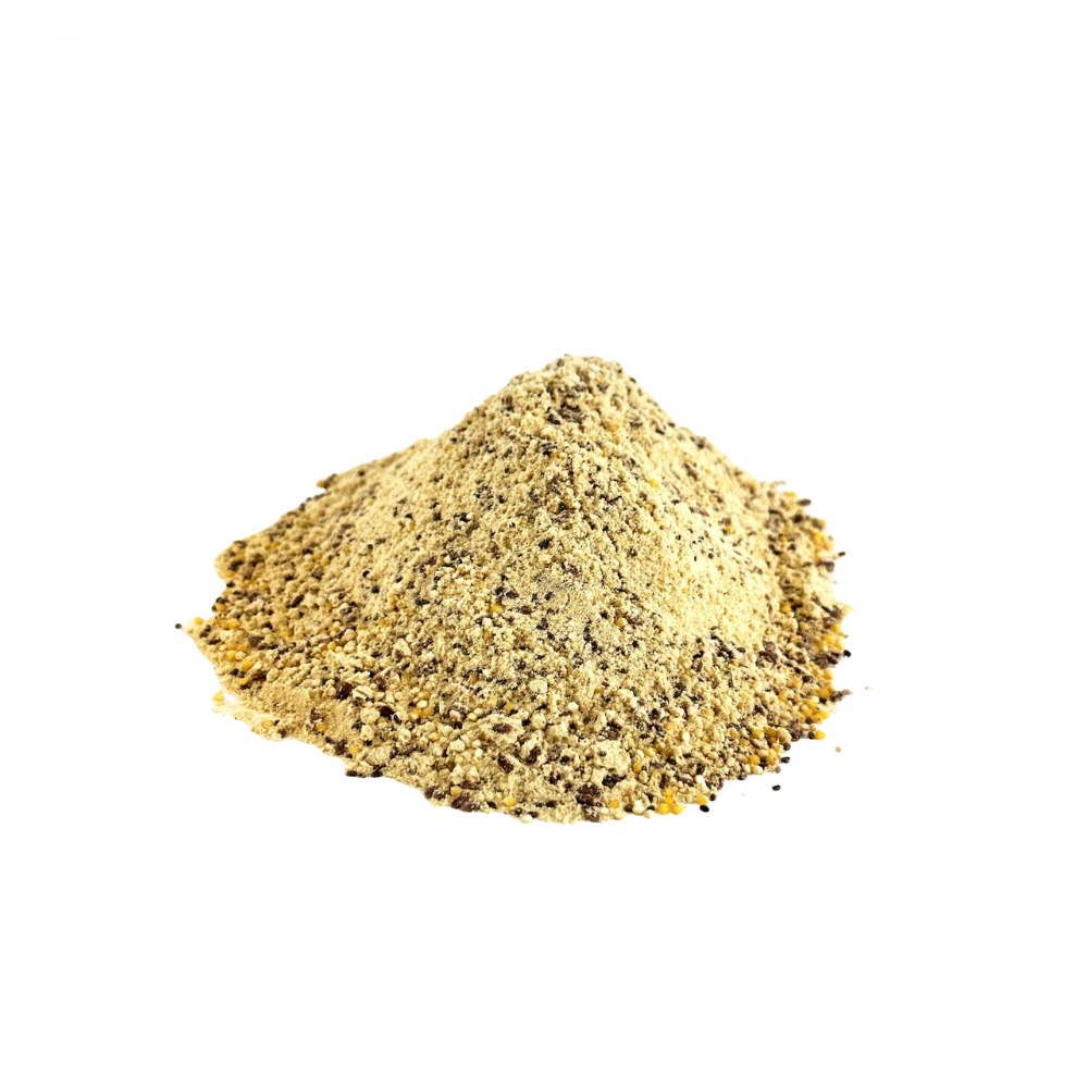Linho, milho, quinoa, painço cinzento, chia, cevada descascada, soja torrada, ervilhas, lentilhas, grãos de amendoim, grãos de girassol, carbonato de cálcio, bicarbonato de sódio, grãos de aveia torrados, arroz integral, alfafa, psyllium, bentonita, tocoferóis mistos (fonte de vitamina E), algas marinhas, sal, farinha de algas, suplemento vitamínico/mineral (palmitato de vitamina A, suplemento de vitamina D3, acetato de dl-alfa tocoferila, suplemento de vitamina B12, suplemento de riboflavina, d-pantotenato de cálcio, niacina, cloridrato de piridoxina, biotina, mononitrato de tiamina, ácido fólico, sulfato de zinco, sulfato de manganês, sulfato de cobre, carbonato de cálcio e óleo de girassol).