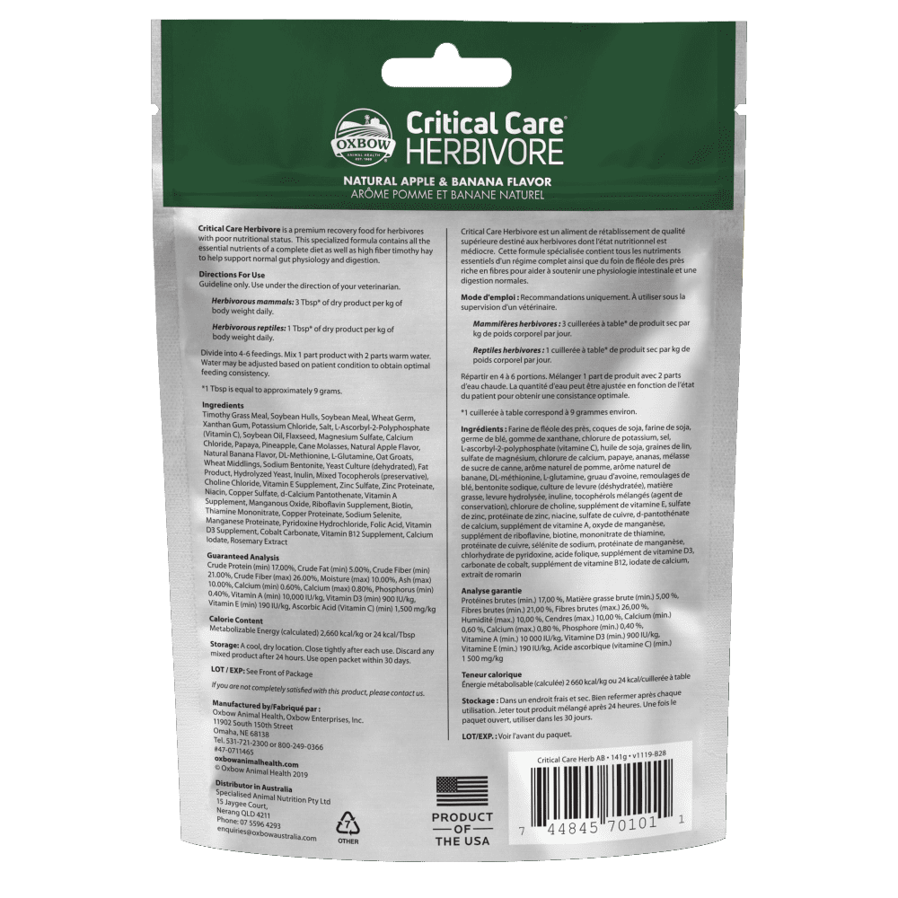 Desenvolvido com a ajuda dos melhores veterinários e nutricionistas de animais exóticos, Oxbow Critical Care® é o padrão da indústria em nutrição de suporte para herbívoros convalescentes, em estado de má nutrição ou em recuperação de intervenções cirurgicas.