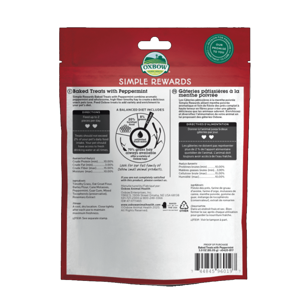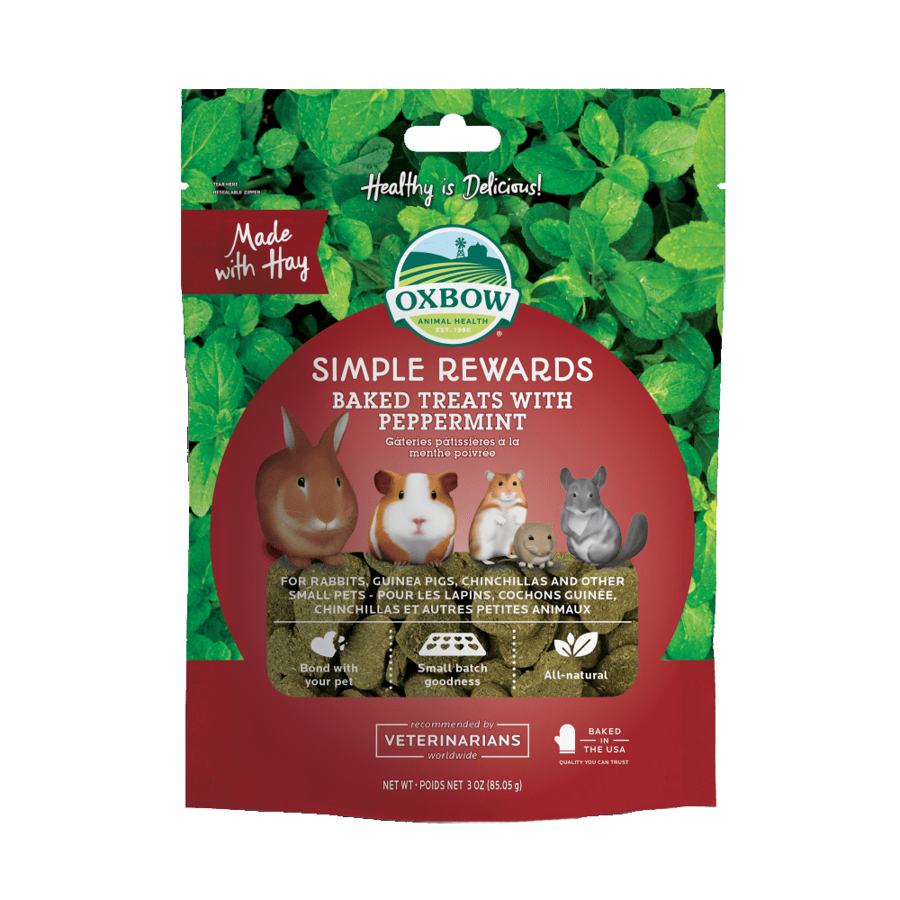 Um snack cheio de sabor, saudável e vibrante! As guloseimas com hortelã-pimenta Simple Rewards combinam a aromática hortelã-pimenta com feno Timóteo, saudável e rico em fibras, para criar um lanche delicioso que coelhos, porquinhos-da-índia, chinchilas e outros pequenos animais de estimação adoram.