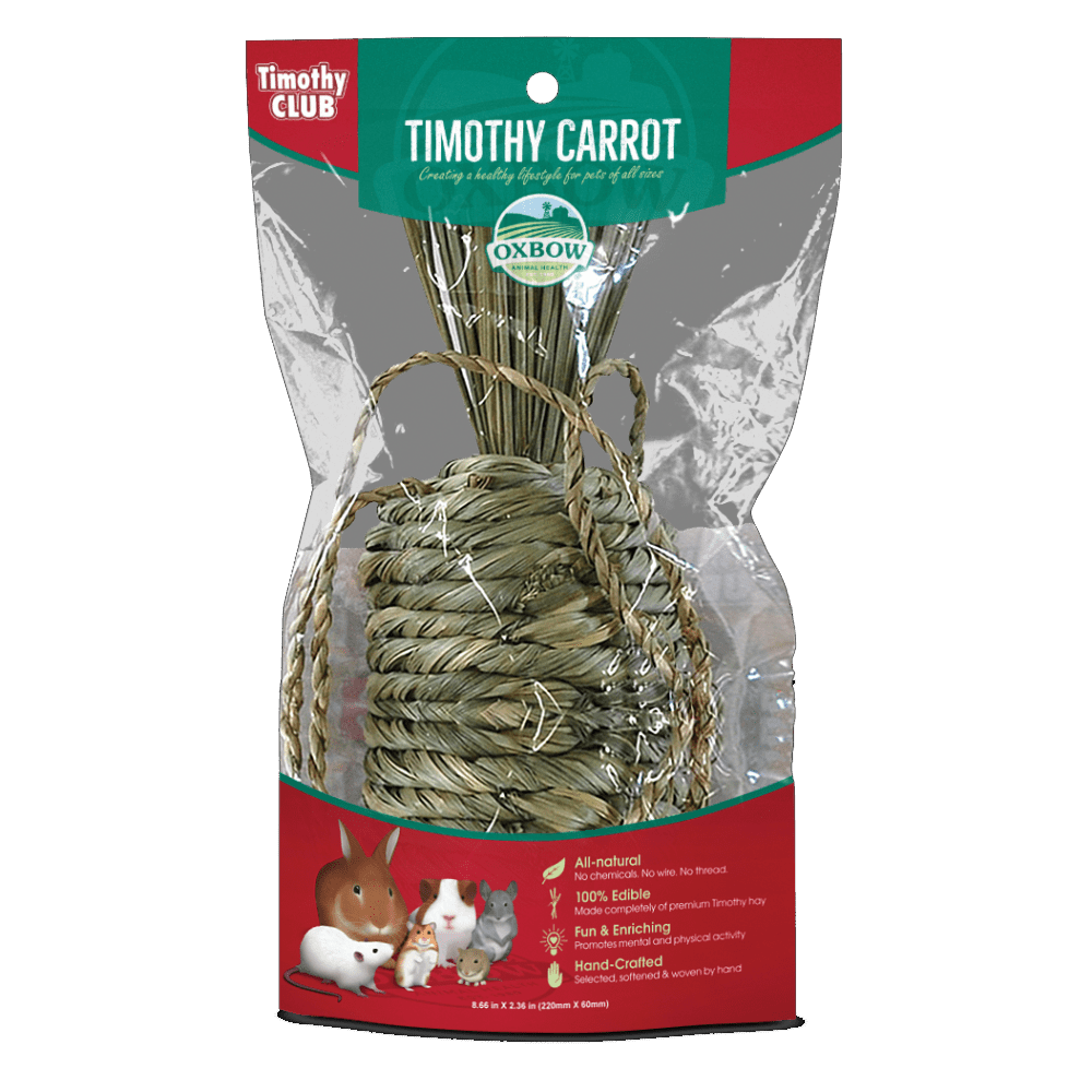 Divertido, enriquecedor e pronto para comer! A Cenoura Timothy CLUB é o acessório perfeito para qualquer herbívoro. Cada cenoura Timothy CLUB é tecida à mão com feno Timóteo 100% puro e premium. A cenoura Timothy CLUB pode não ter vindo do jardim, mas o seu coelho, porquinho-da-índia ou chinchila certamente vai adorar. Este acessório versátil pode ser colocado em qualquer parte do habitat do seu animal de estimação ou pendurado no local apropriado para estimular a mastigação e a interação.