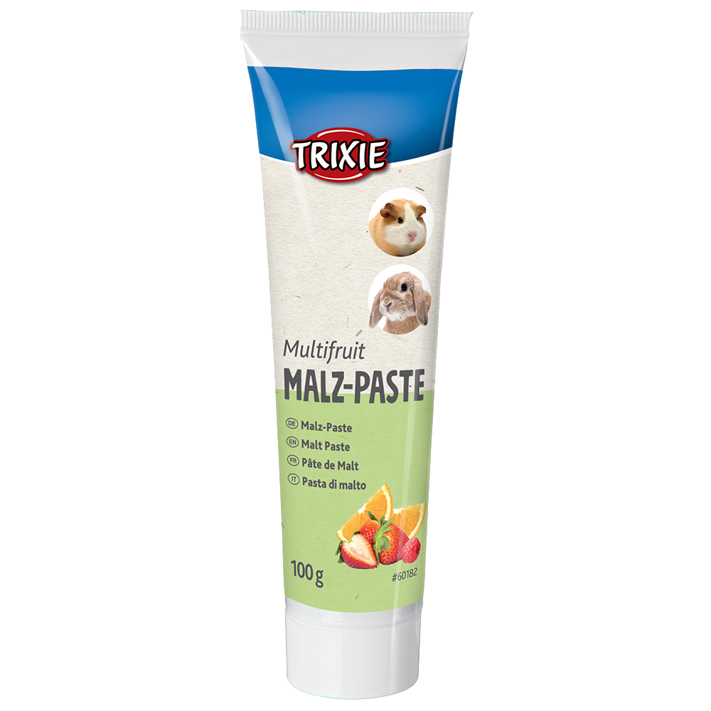 • Bisnaga TRIXIE pasta multifrutas com imagens de coelho e porquinho-da-índia, texto Multfruit MALZ-PASTE, 100 g