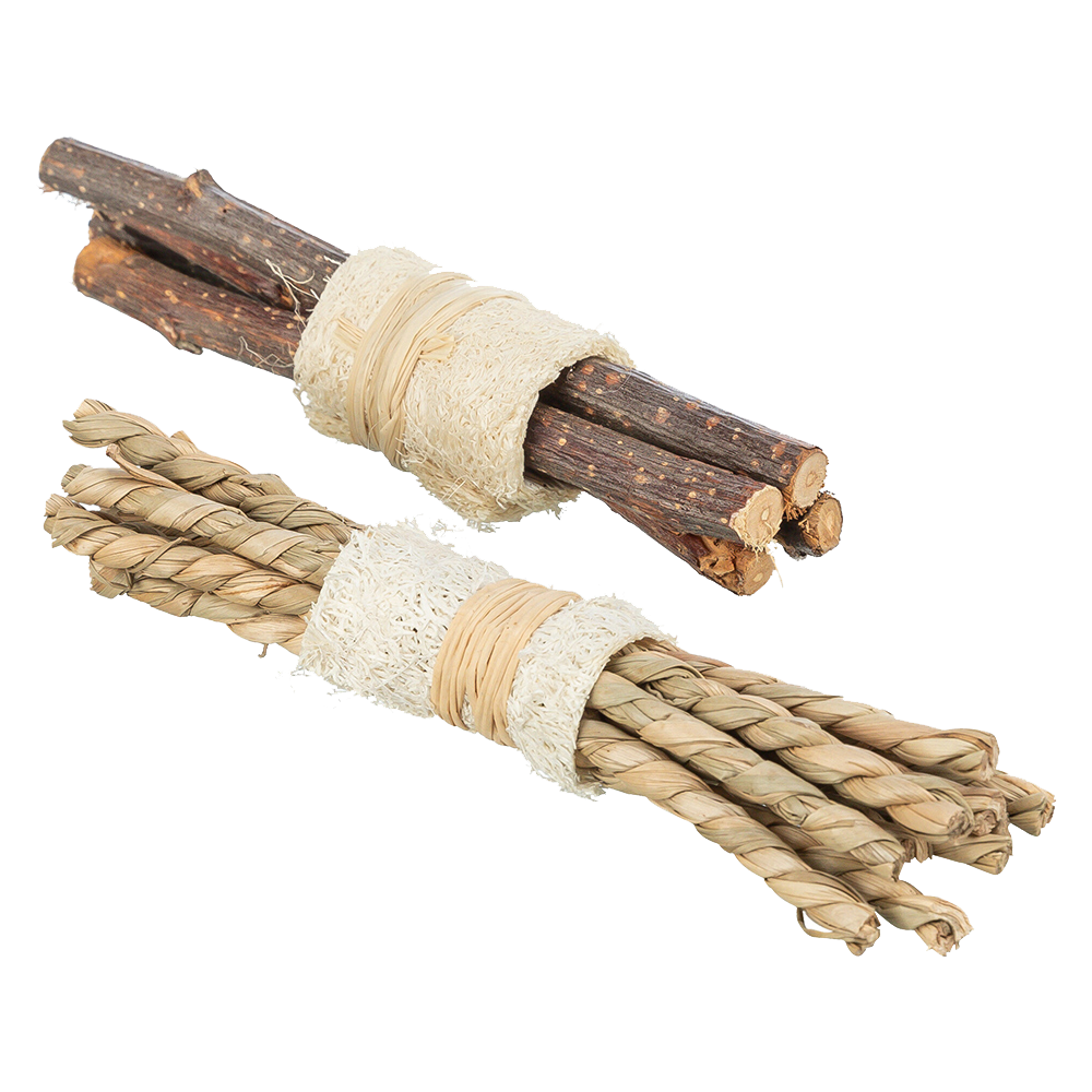 Pauzinhos com lufa e corda de algas 3,45 € Desconto de %. IVA incluído. Partilhar Compre este produto e ganhe 14 Pontos Exóticos! Comprar Contactar 2 unidades em stock | SKU: TX61827 - feita de materiais 100% naturais- auxilia no desgate dos dentes- lufa, madeira e algas marinhas- 10 x 3 cm- 2 unidades Marca Trixie Características