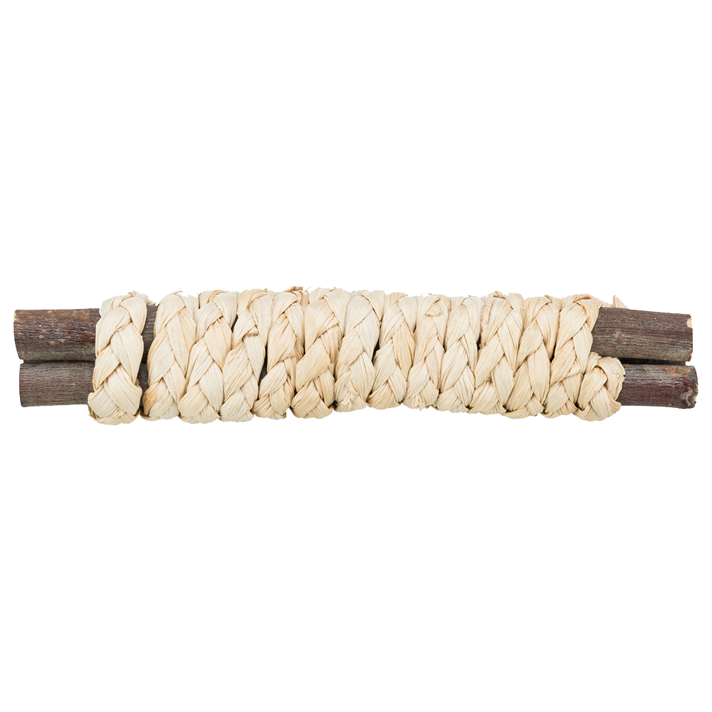 • Ramos de madeira entrelaçados por corda grossa de fibras naturais claras em fundo branco.