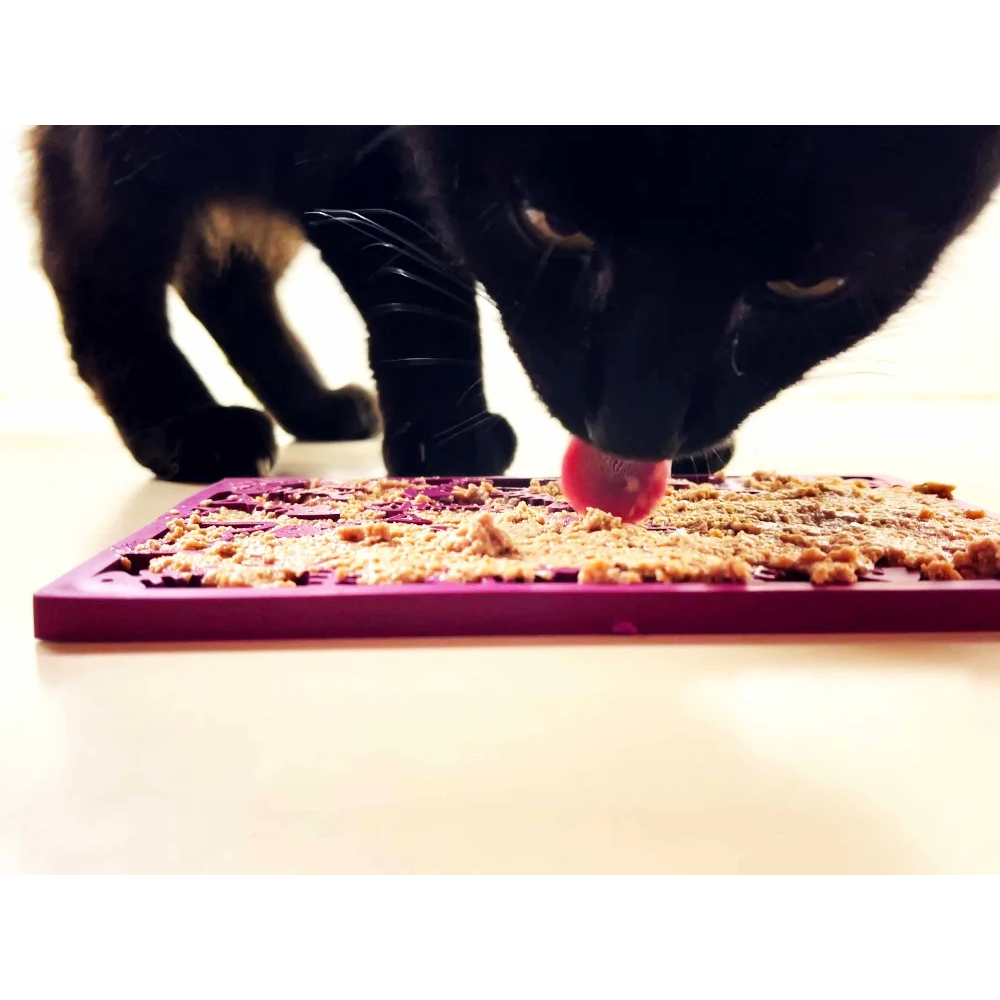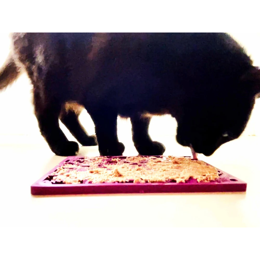 ENRIQUECIMENTO: Lamber acalma e acalma os seus cães e gatos. Espalhe o snack macio favorito do seu animal de estimação na superfície do eMat, certificando-se de que o snack é empurrado para baixo na superfície do tapete.