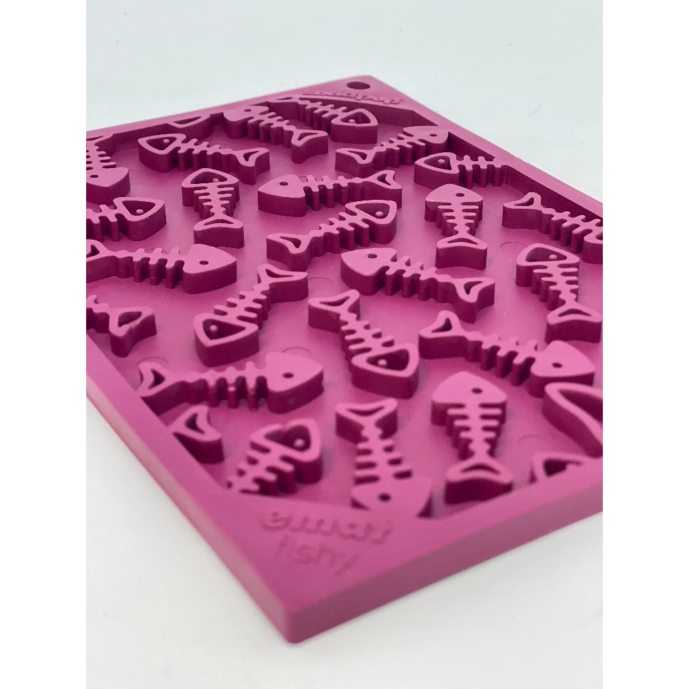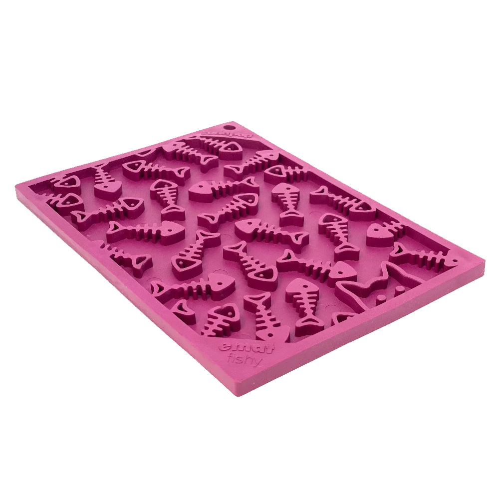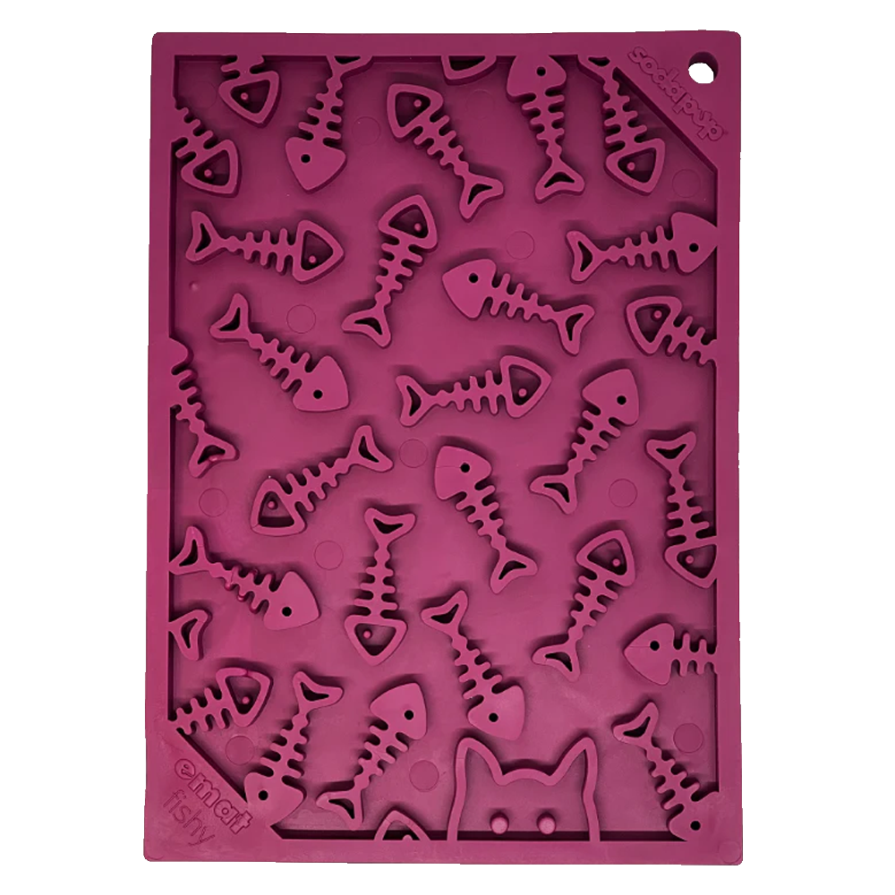 Torne a hora da refeição divertida para o seu animal de estimação com este tapete para lamber eMat da Fishy Design! Com o seu padrão único de esqueleto de peixe e a sua vibrante cor ameixa, o seu gatinho vai adorar lamber com este pequeno tapete de enriquecimento eMat. Guloseimas? Que guloseimas? (piscadela, piscadela)