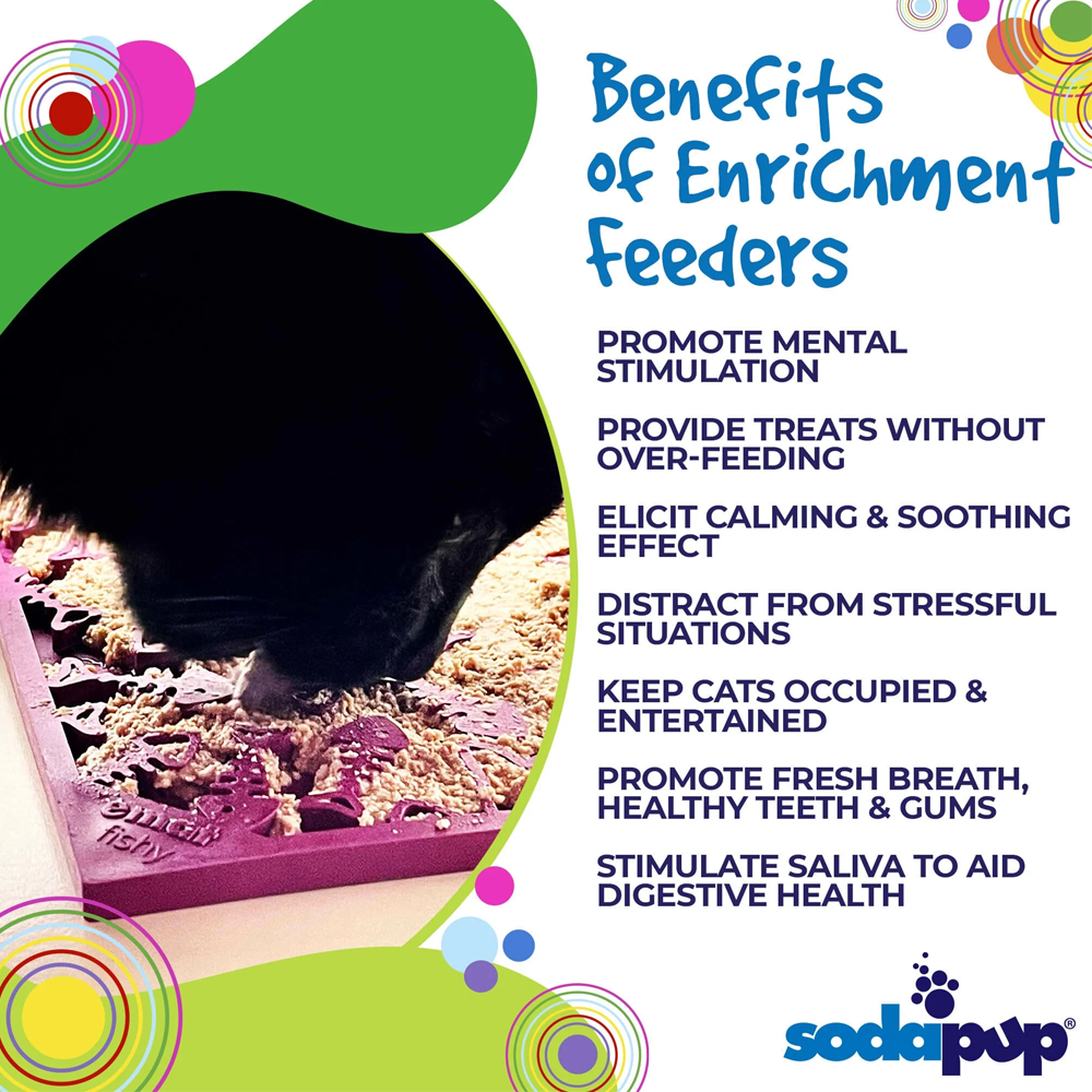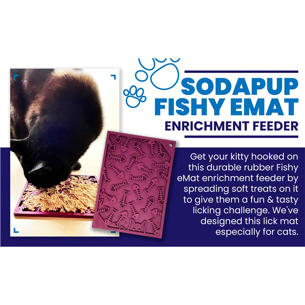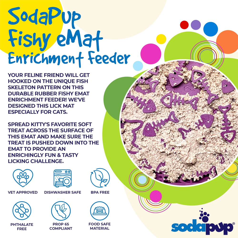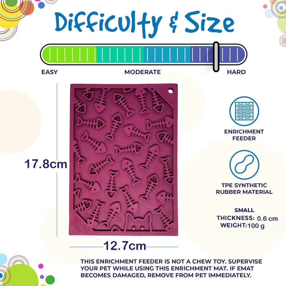 Torne a hora da refeição divertida para o seu animal de estimação com este tapete para lamber eMat da Fishy Design! Com o seu padrão único de esqueleto de peixe e a sua vibrante cor ameixa, o seu gatinho vai adorar lamber com este pequeno tapete de enriquecimento eMat. Guloseimas? Que guloseimas? (piscadela, piscadela)