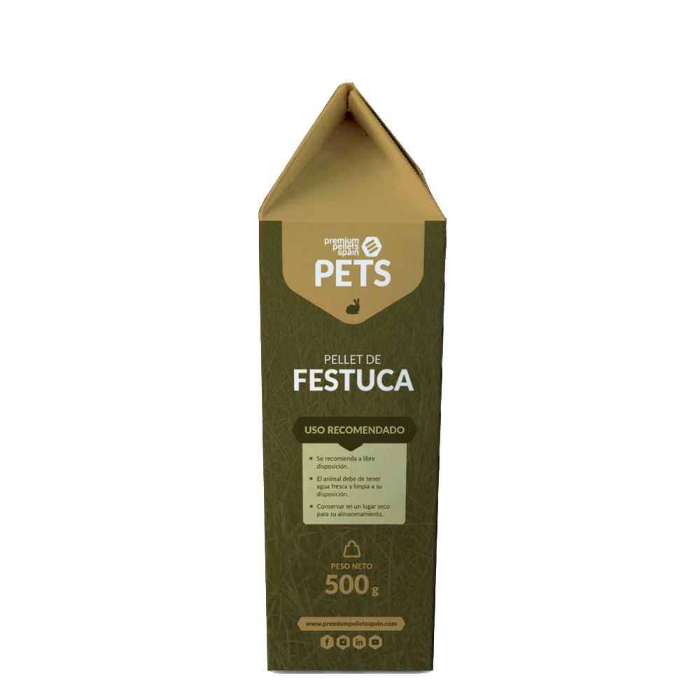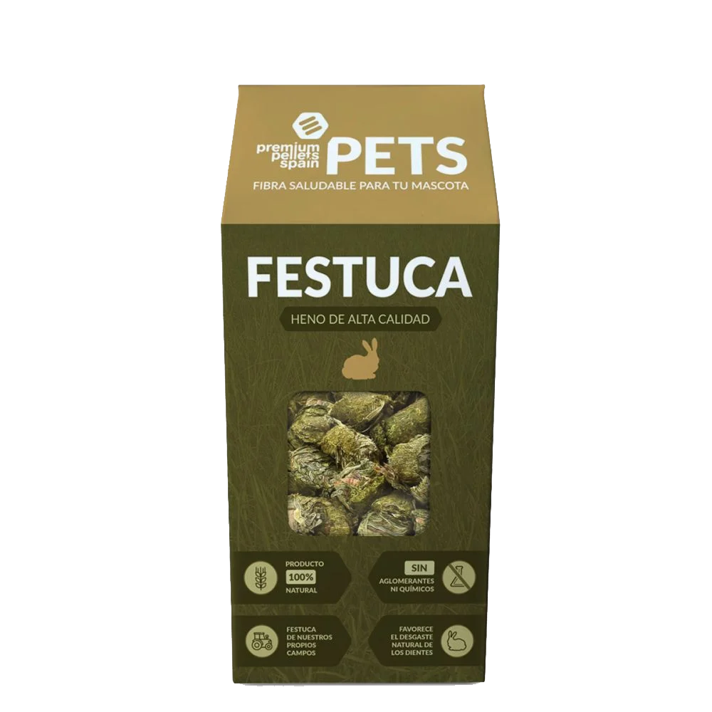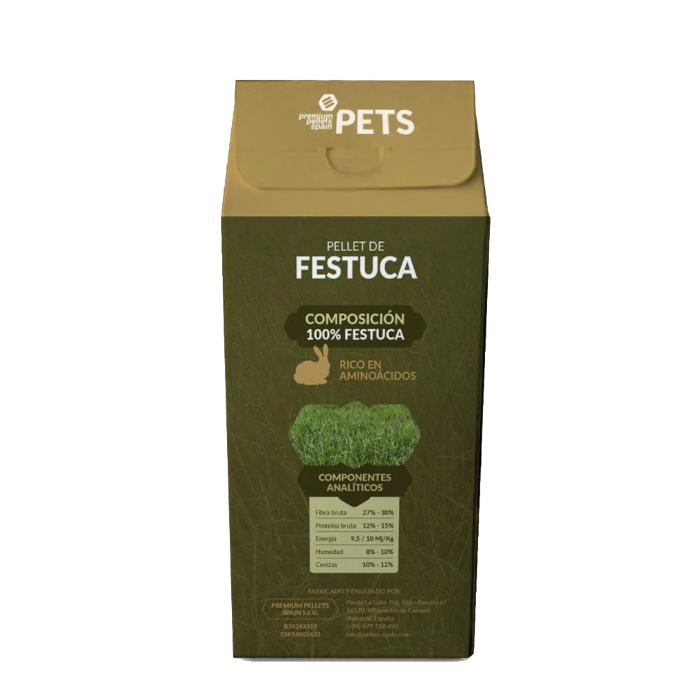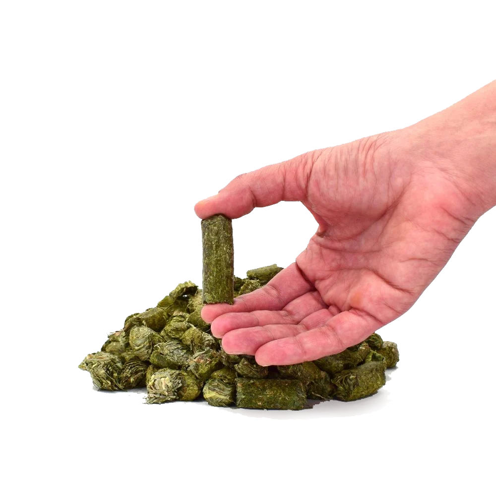 Pellets de feno de festuca com diâmetro de 16mm, com fibra longa de 1 a 2,5 cm, o que torna o produto um formato perfeito para coelhos e roedores herbívoros.