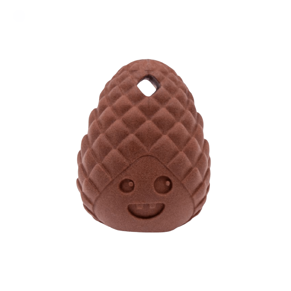 • Produto em forma de pinha castanha com rosto sorridente e textura quadriculada