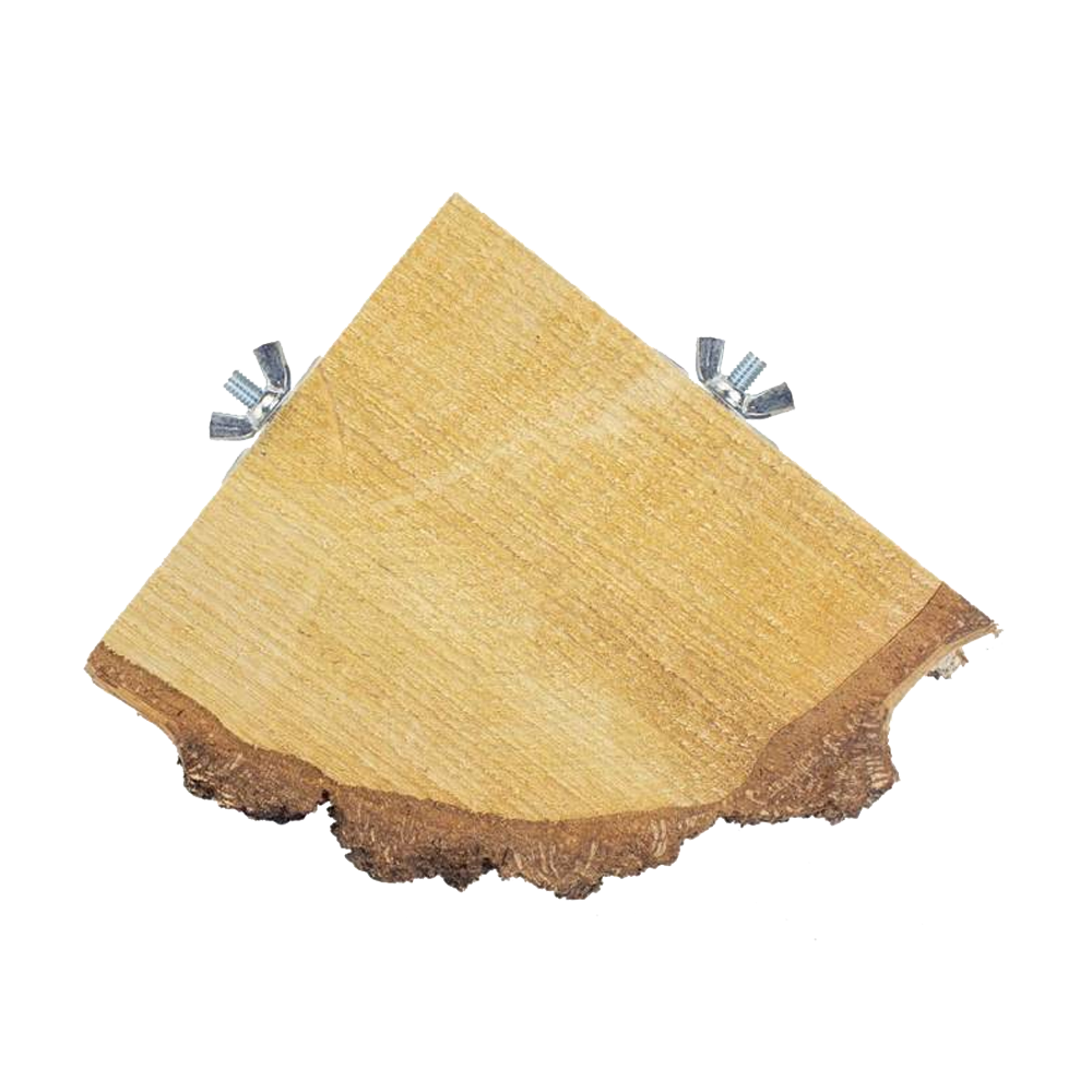 Quadrado de madeira natural com borda irregular e ferragens para fixar