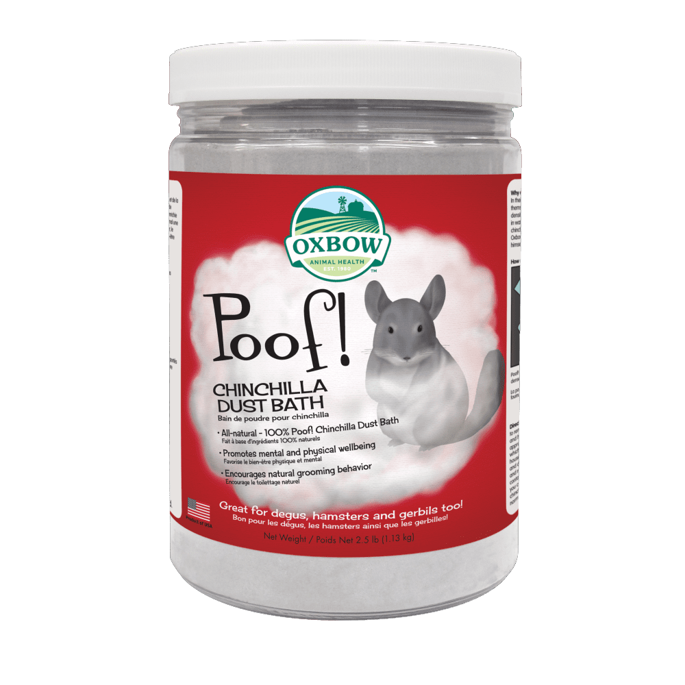 Dê o banho de pó para a sua chinchila 2 a 4 vezes por semana para remover o excesso de oleosidade e sujidade da sua pelagem, e garantir a maciez e o estado saudável de seu pelo. Para o banho, utilize um recipiente adequado para colocar o pó de banho. Remova o recipiente do banho de pó da gaiola após 3-5 minutos para evitar sujidade e exposição excessiva à poeira. Se o pó estiver sujo, remova e substitua. A Oxbow recomenda que você consulte seu veterinário antes de usar qualquer produto para banho de pó de chinchila se o seu animal de estimação estiver com comportamentos diferentes do normal ou se estiver doente.