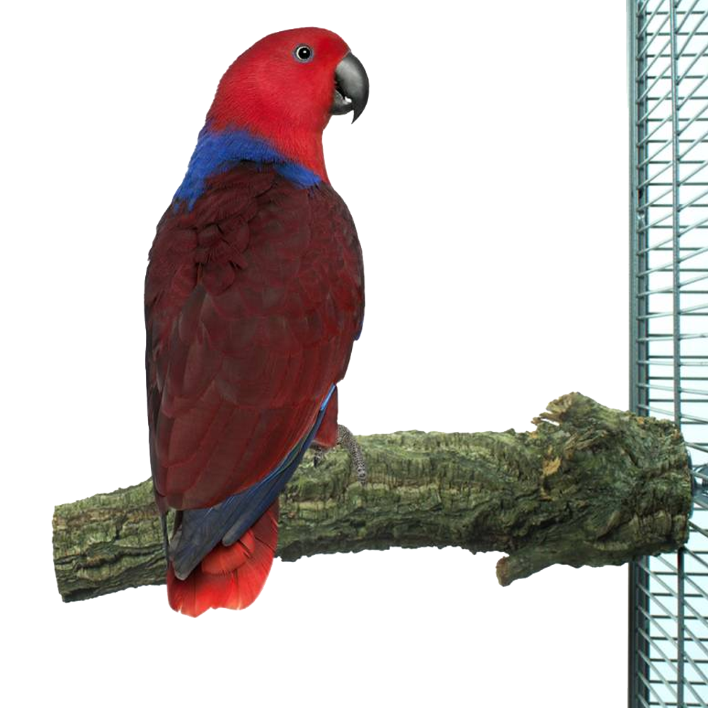 • Papagaio Ecletus vermelho e azul sobre galho de madeira numa gaiola