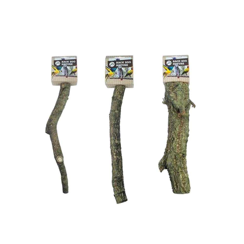 • Três paus naturais para pássaros com etiquetas da marca Back Zoo Nature