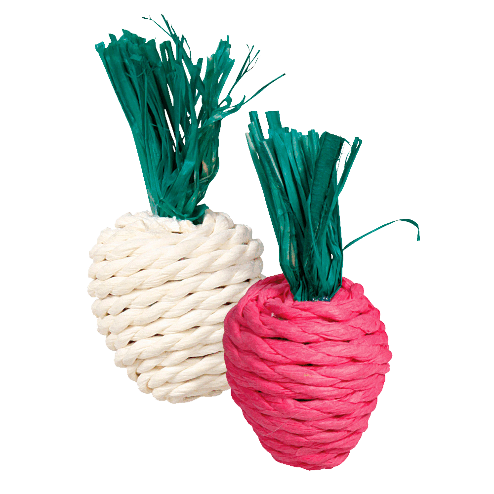 • Dois brinquedos para animais em forma de cenoura feitos com corda trançada, um branco e outro vermelho com topo verde