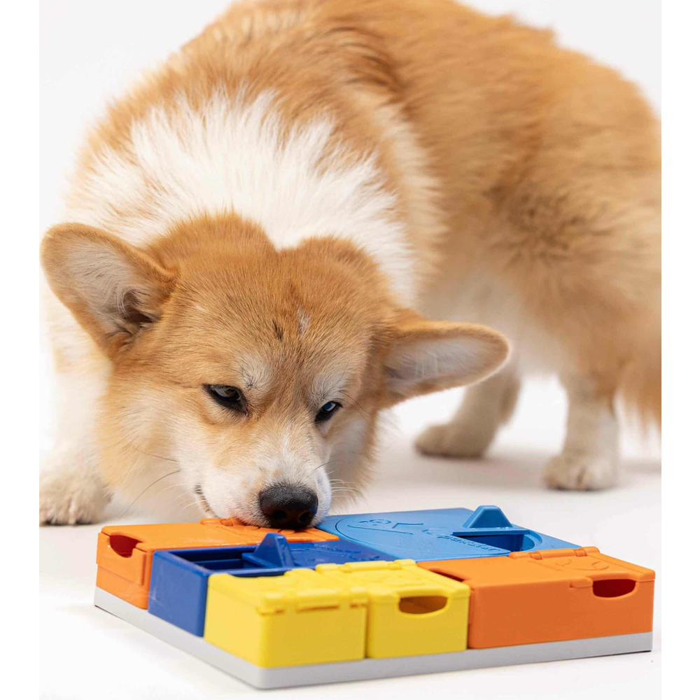 Pode encher os compartimentos com guloseimas, comida normal para cães ou até manteiga de amendoim para o seu cão encontrar. Dica: Se rodar os botões amarelo e laranja em diferentes direções, pode alterar o nível de dificuldade do brinquedo.