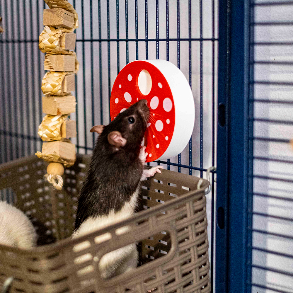 Este brinquedo é constituido por uma base de foraging wheel classica com uma tampa tematica que representa um cogumelo.